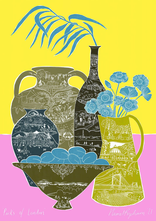 Harriet Popham makes bright, cheerful prints celebrating special places and moments in time. The majority Harriets prints are inspired by places. Often beautiful parts of the UK and Italy. Her work is often a response to a moment in time or a place, seeing it from every angle before piecing it together as a print.