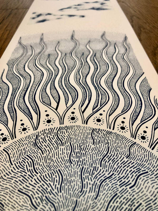 Emma’s practice is inspired by landscape and the human connection with nature. By journeying across the British Isles, Emma documents the land through photography and drawings to create slow textiles with narrative that encompass a sense of place and create a meaningful connection between people and cloth.