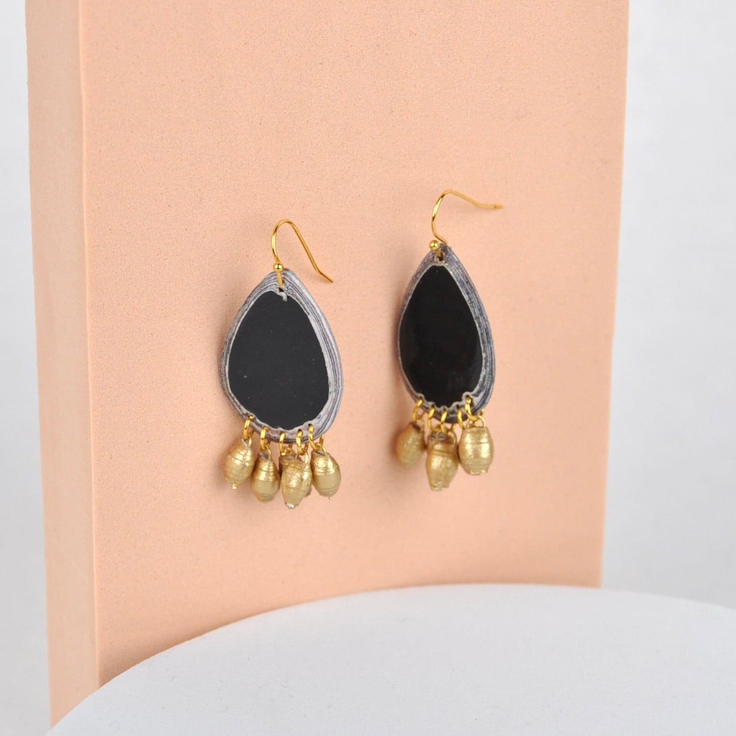 Beautiful handmade paper magazine earrings using Quazi's rolled bead and pulp technique. Using only 100% waste magazine paper and varnished for durability, these unique earrings are made to last.
