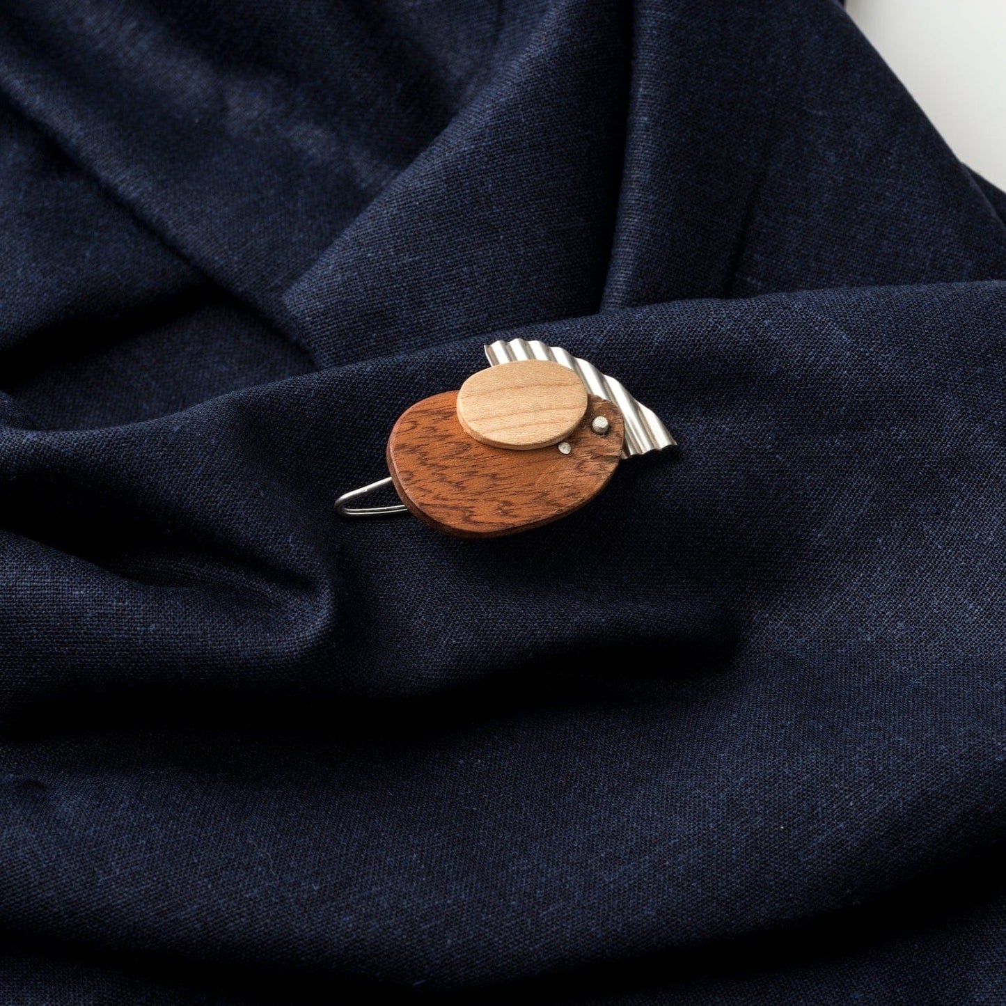 There is a rich and contrasting colour pairing between the Ipe wood - that was once the hatch of a 18th Century ship, and the clean, bright tones of the maple wood - that was once the bowling alley of The Dolphin in Weston Super Mare. The wood is finished with such high grade sand paper they feel like smooth, pebbles of glass that have spent a lifetime in the sea. The Sterling silver- certified Ecosilver, (100% recycled) details and fastenings, add flare and contemporary styling that makes them wearable pieces of art. The shapes and textures work in harmony with the reclaimed wood: making the silver shine brighter and the wood grain richer - even the back of each brooch is beautiful!