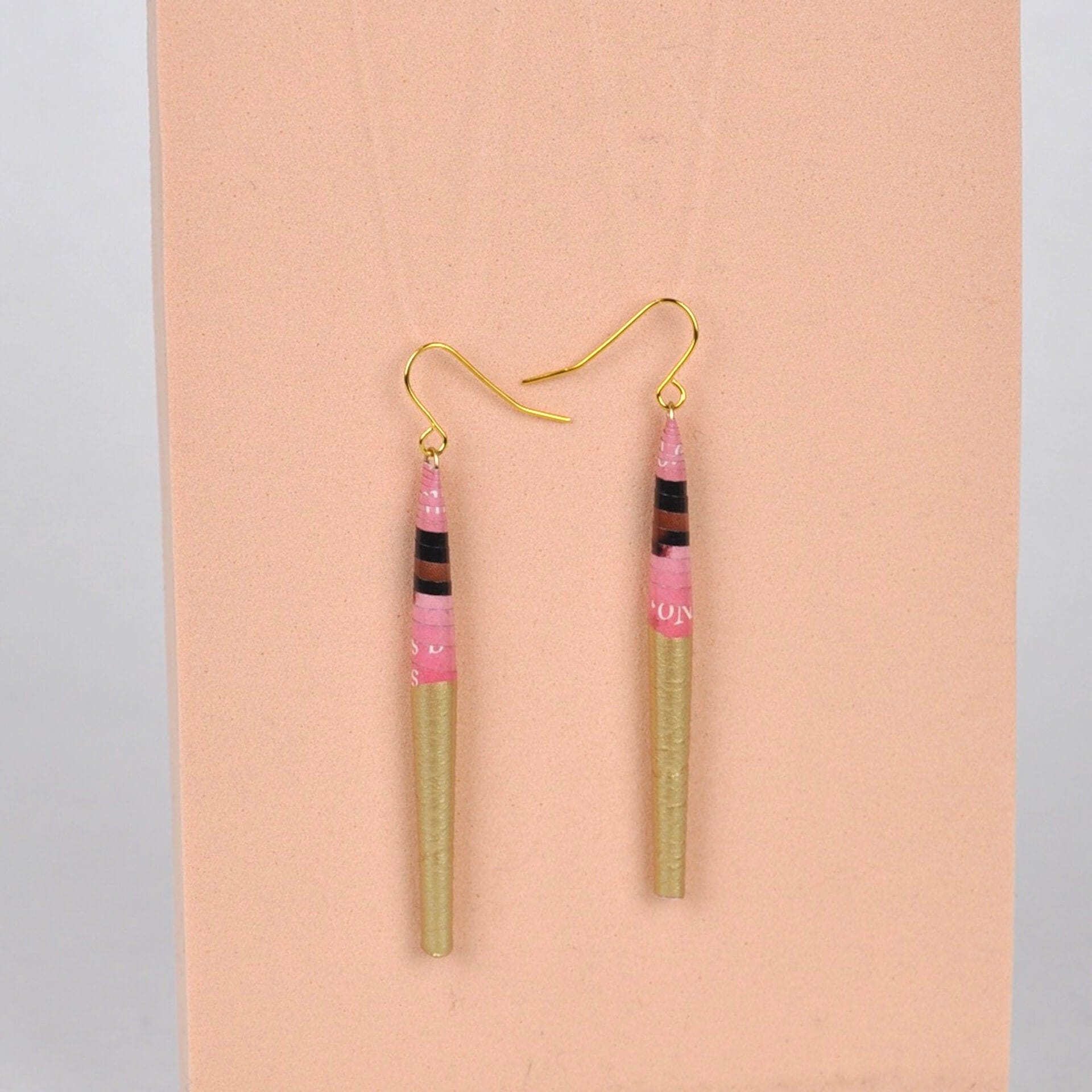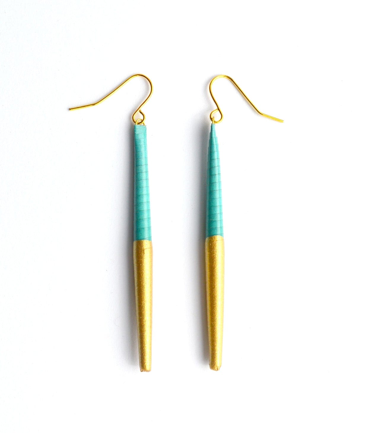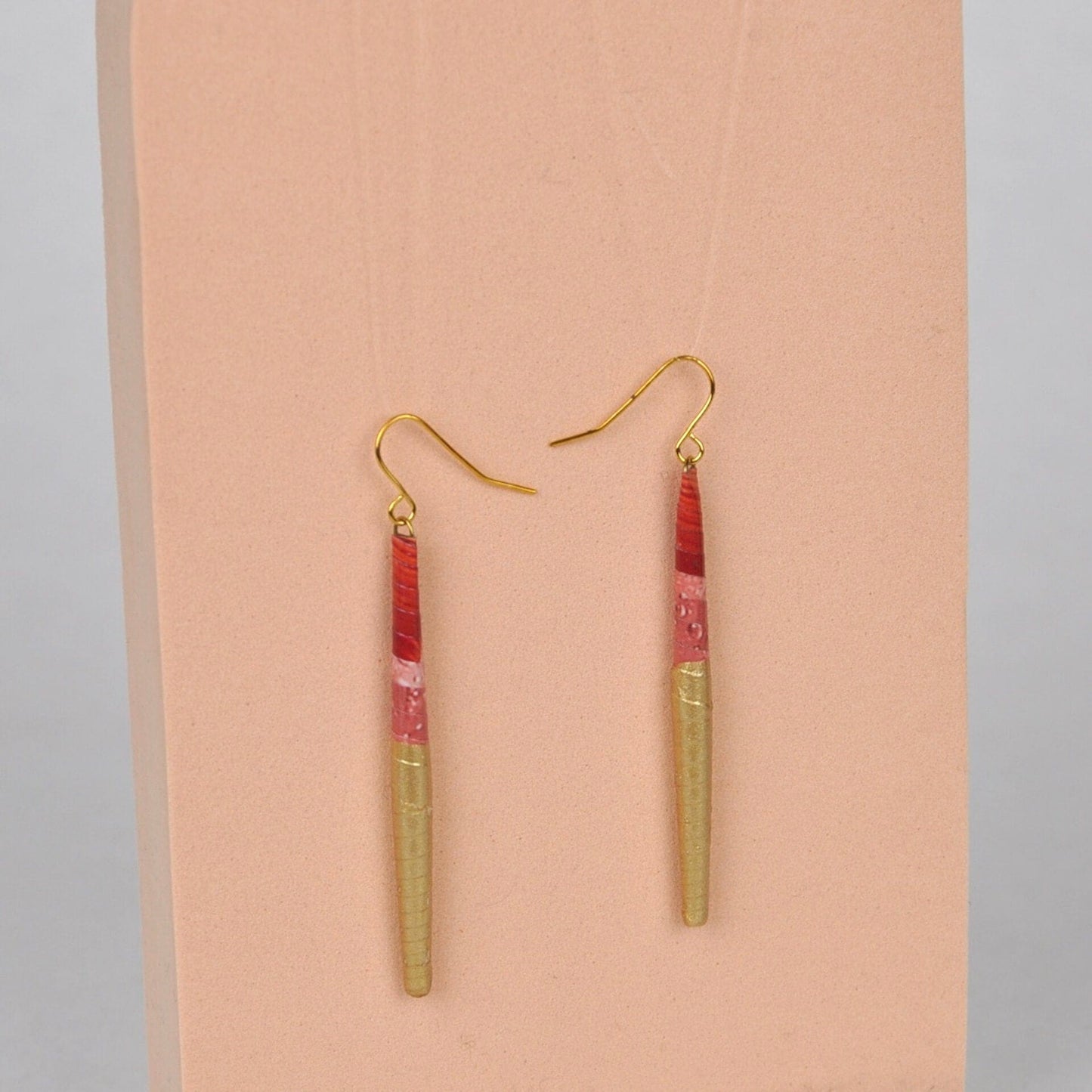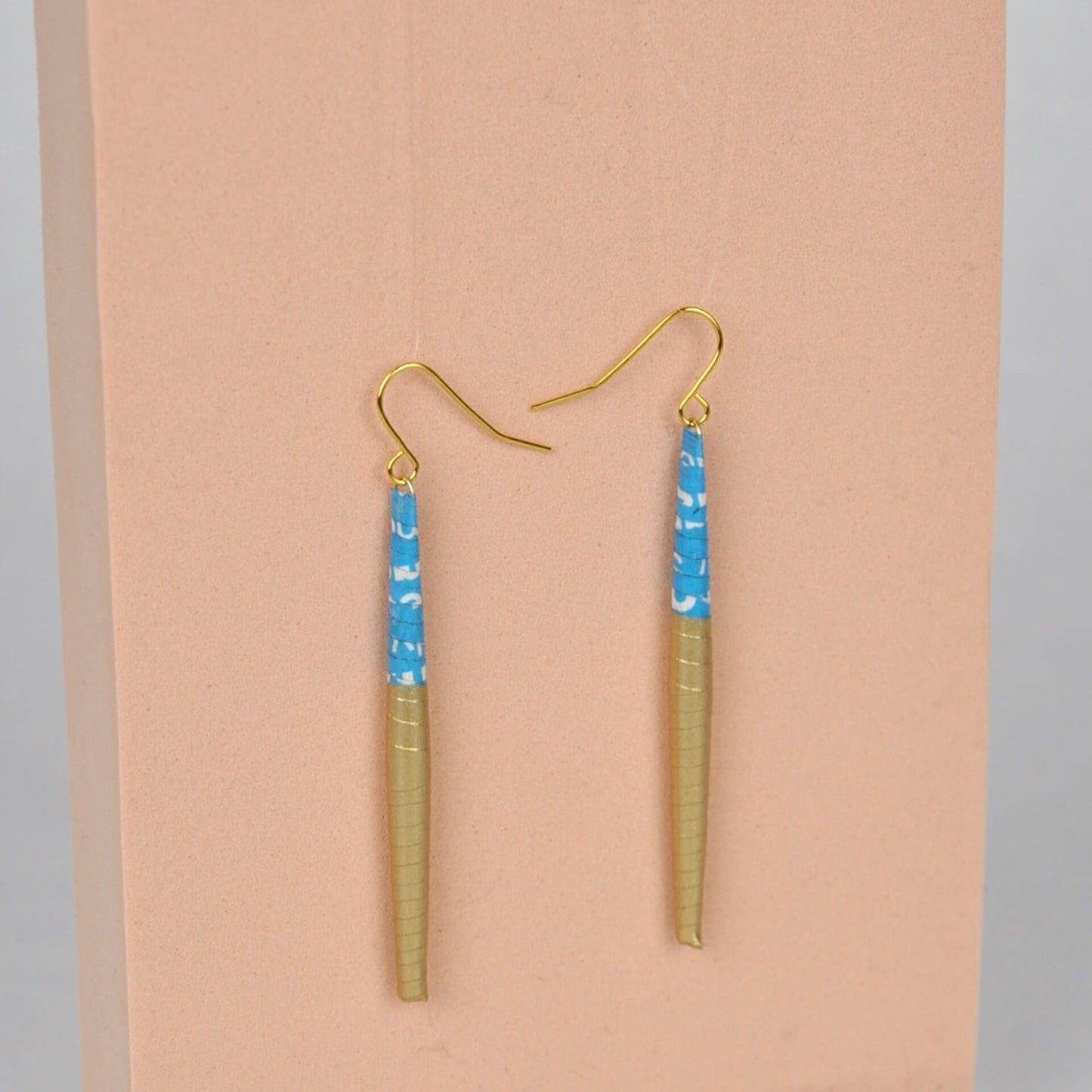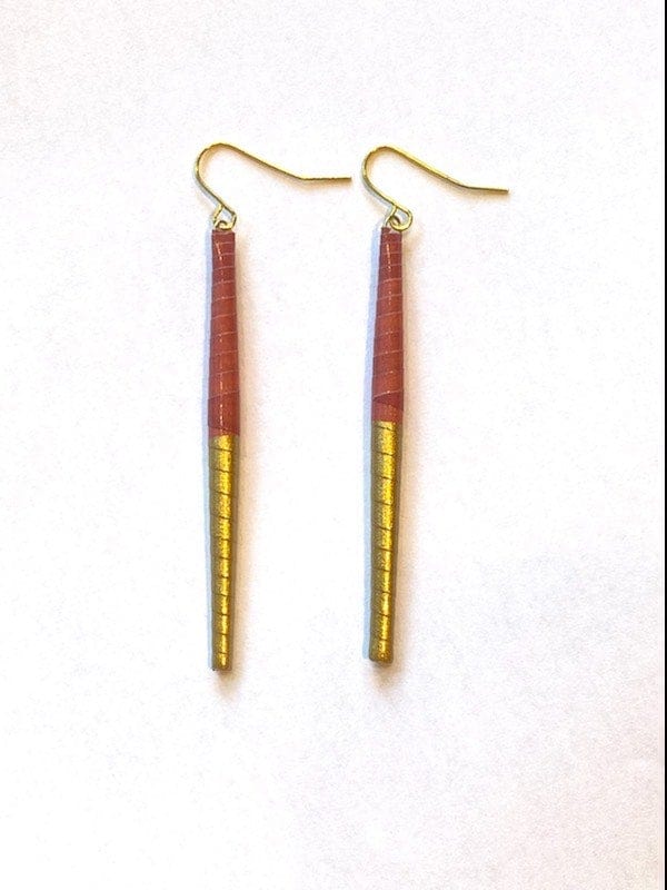 Beautiful handmade paper bead earrings from sustainable brand Quazi, dipped in gold paint and varnished for durability. Perfect everyday earrings, easy to wear, light and original.