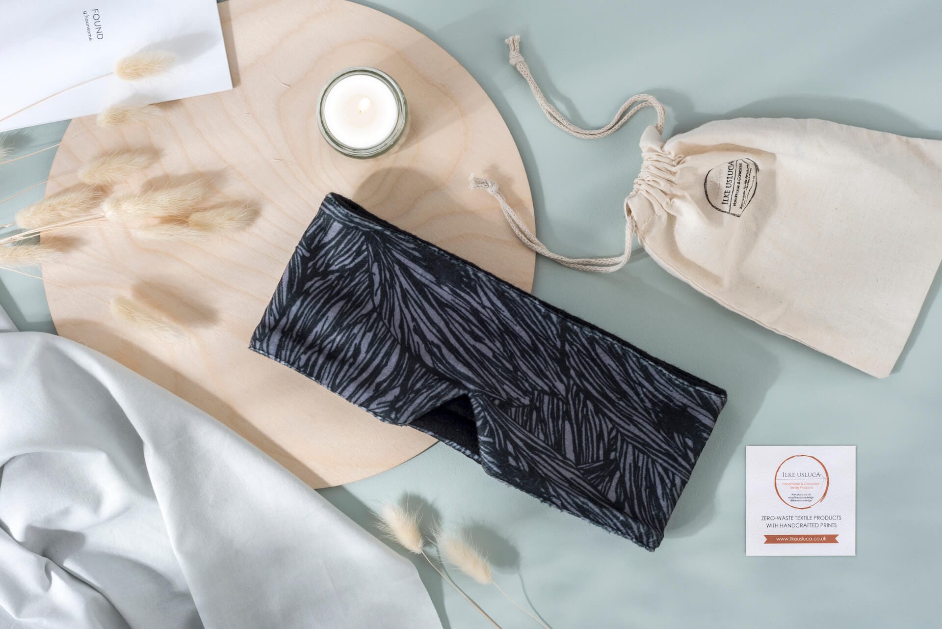 Drift off to sleep with this handmade Black 'Calm' wrap sleeping mask from Ilke Usluca Design: perfect for those who need a good night's rest.