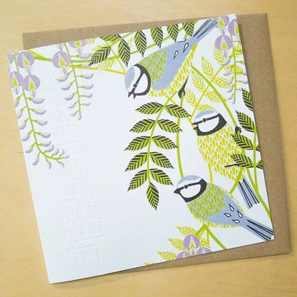 Stunning spring card from Ash Leaf Printmakers taken from an original Lino cut by Ashley Hutchinson. Featuring three Blue tits and wisteria fronds this is the perfect card to spread a happy spring vibe.