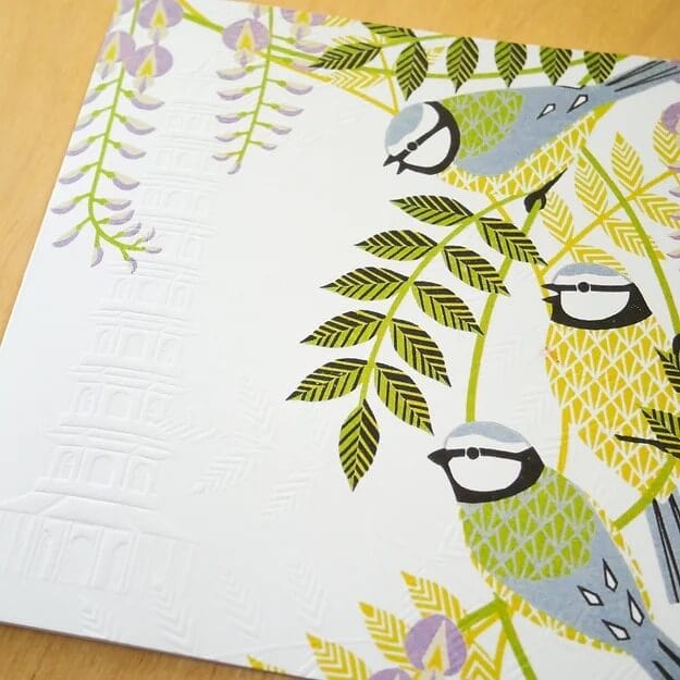 This card is a lovely cheerful depiction of the well known garden bird the Blue Tit. The original print is called 'Blue Tits at Kew' and just like its counterpart this card also has delicate hand embossing. Gentle greens and lilacs make for a peaceful colourway suitable for anyone.