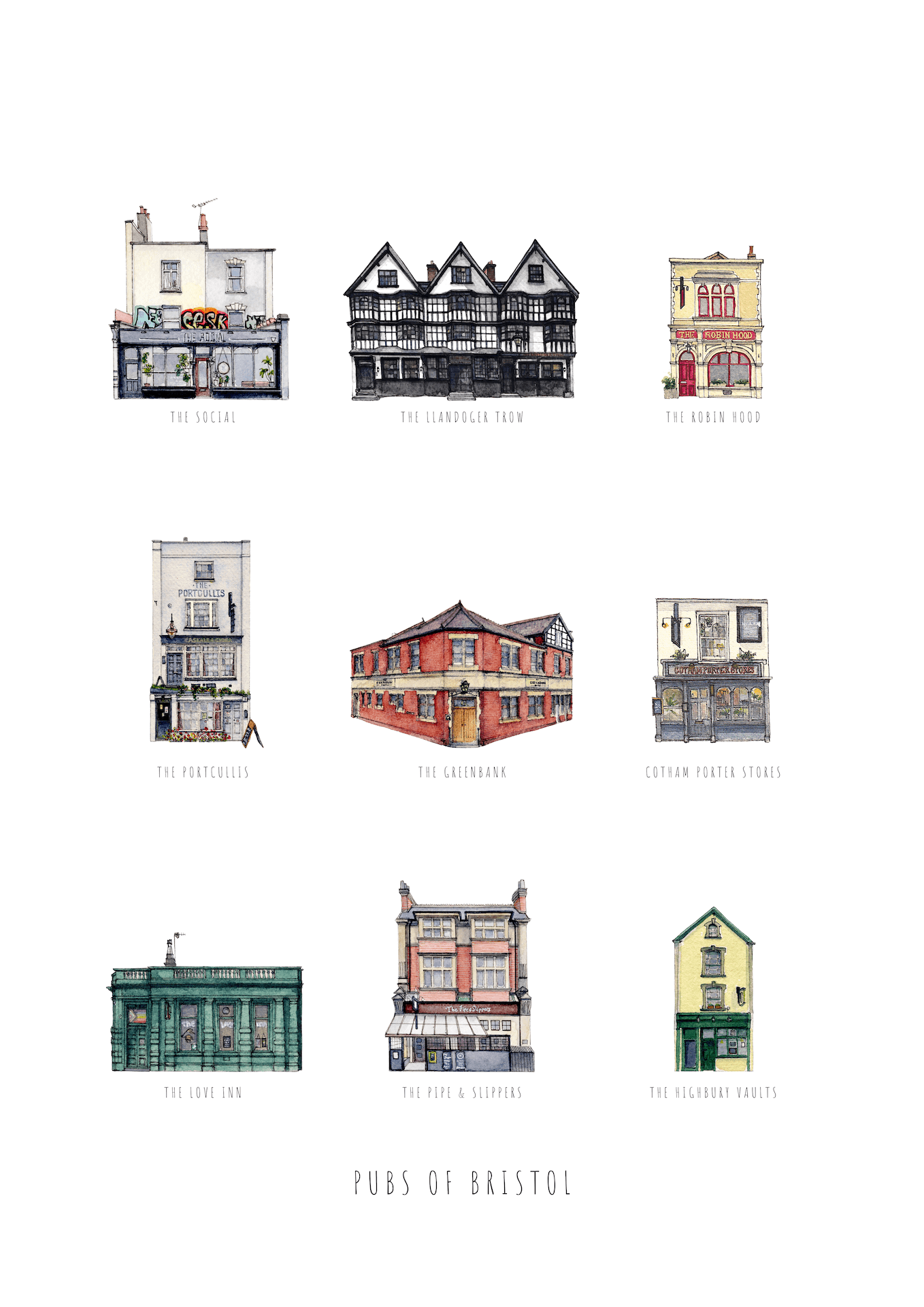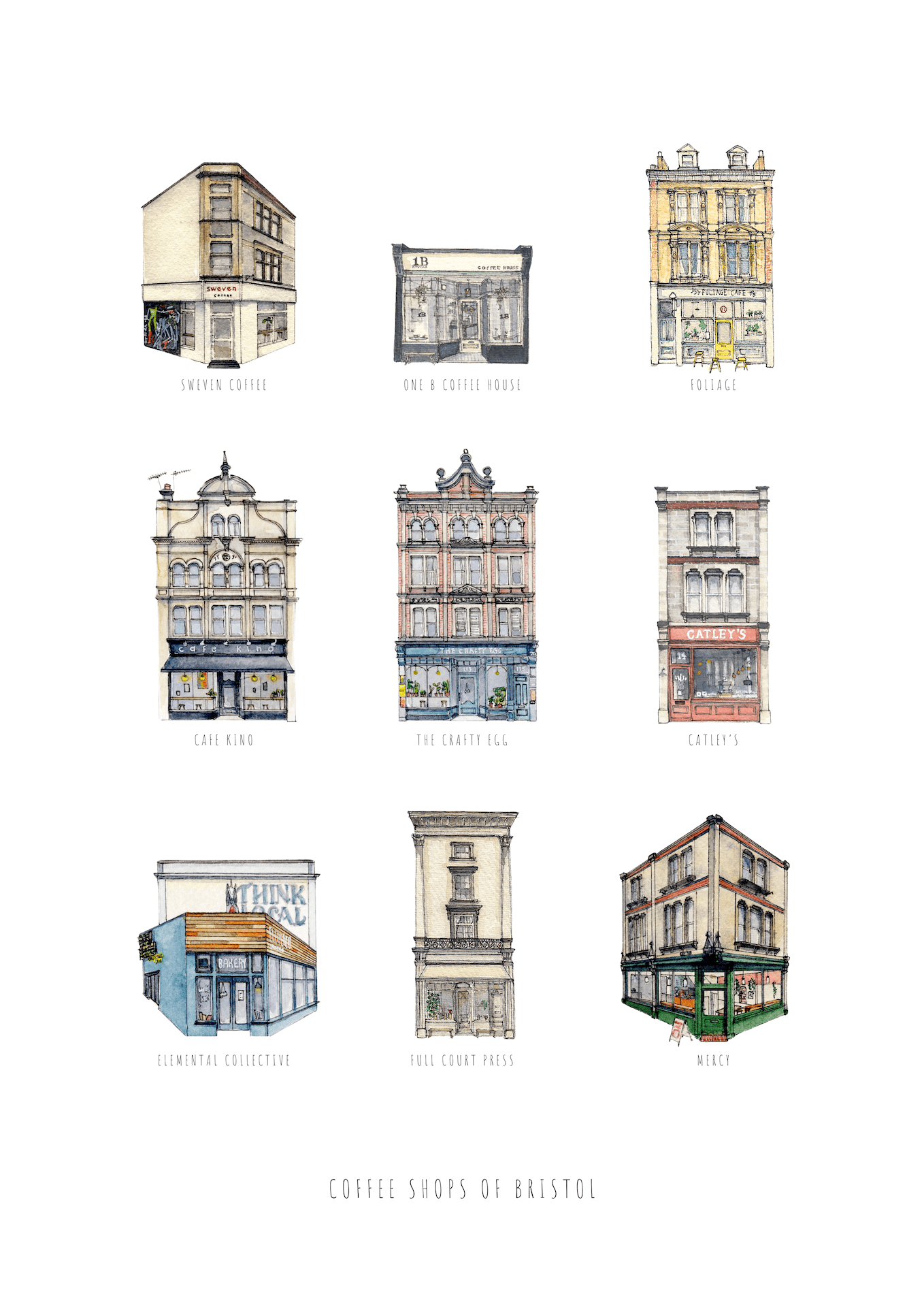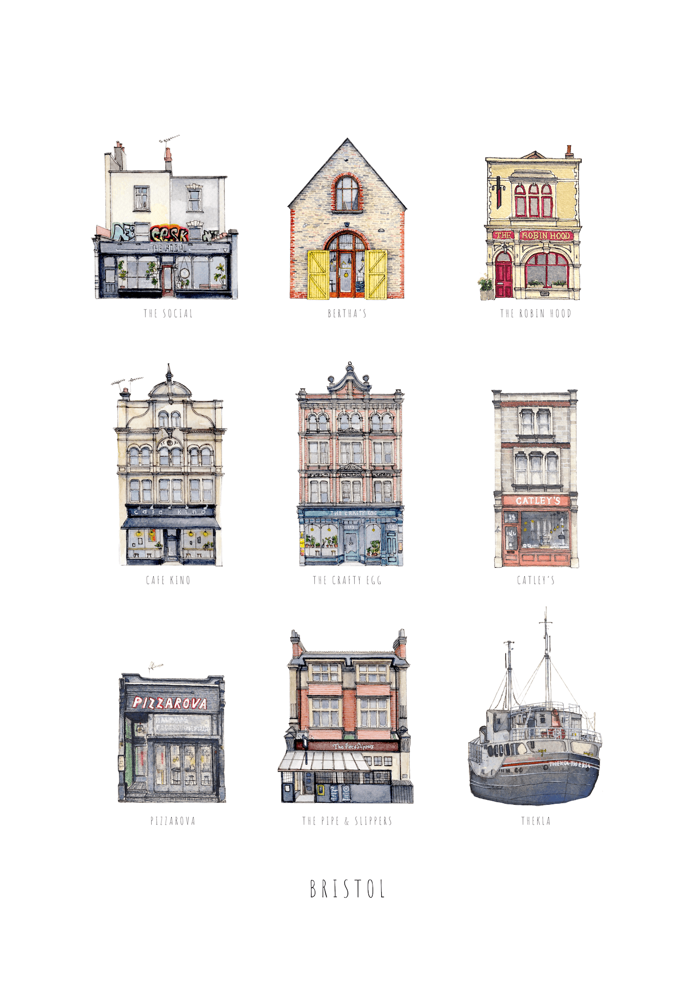 A vibrant collection of A5 watercolor prints celebrating Bristol's iconic independent businesses and lively communities