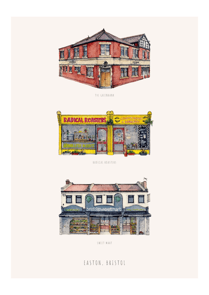 Poppy is a watercolour artist celebrating Bristol's wonderful independent businesses.. This stunning collection of A5 prints showcases iconic Bristol landmarks, including the vibrant, lively communities of Eason and Stokes Croft.