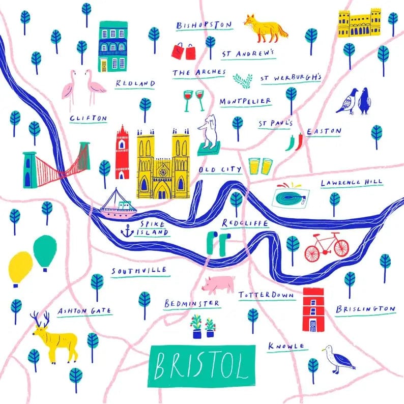 Illustrated map of Bristol highlighting different areas and illustrations of local sights.