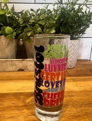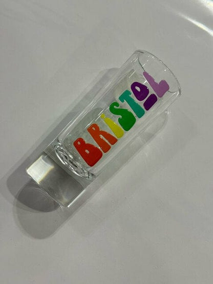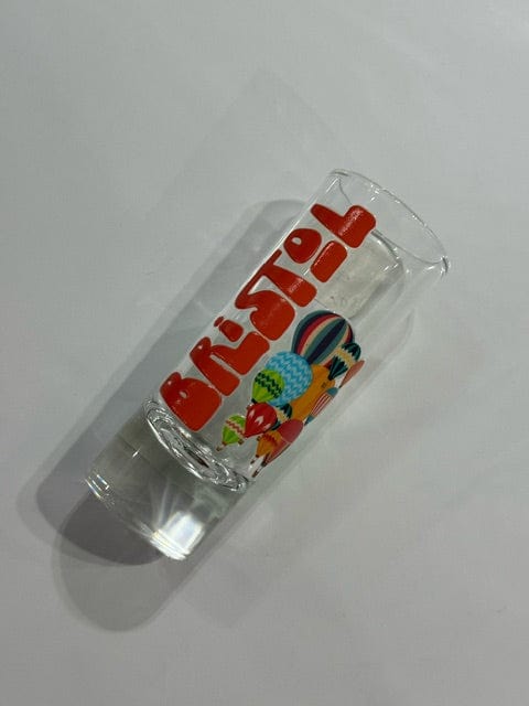 Colourful Bristol-themed shot glass with different designs.