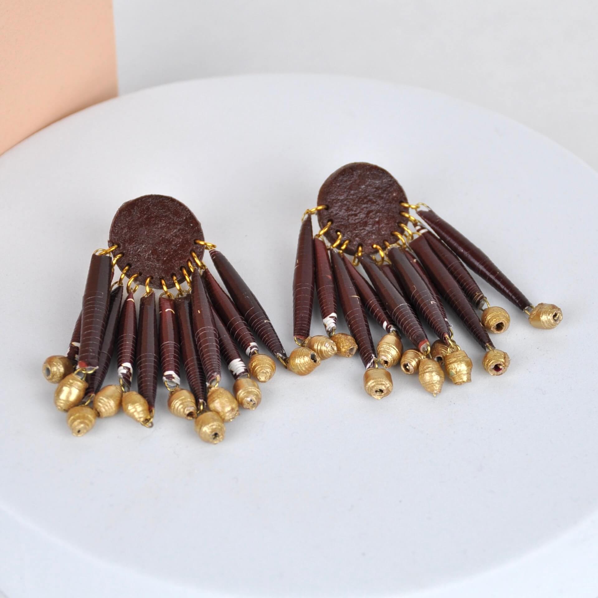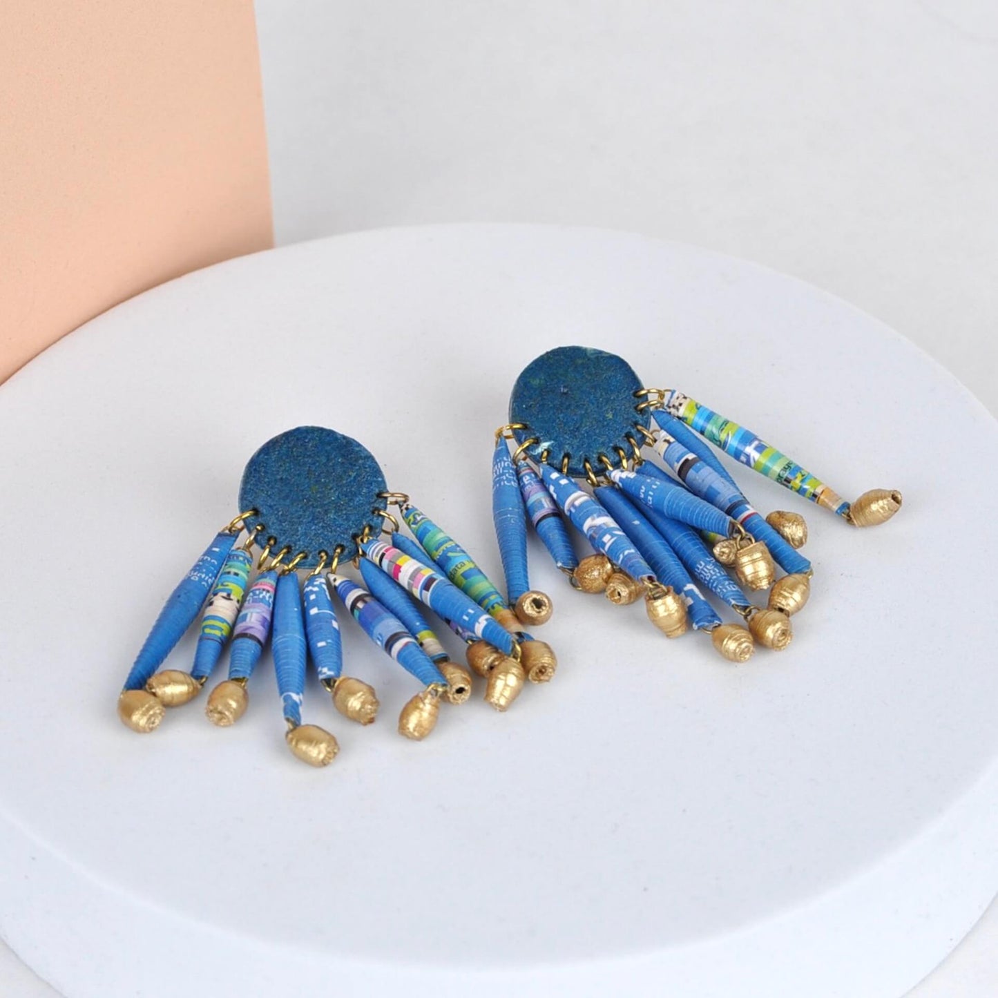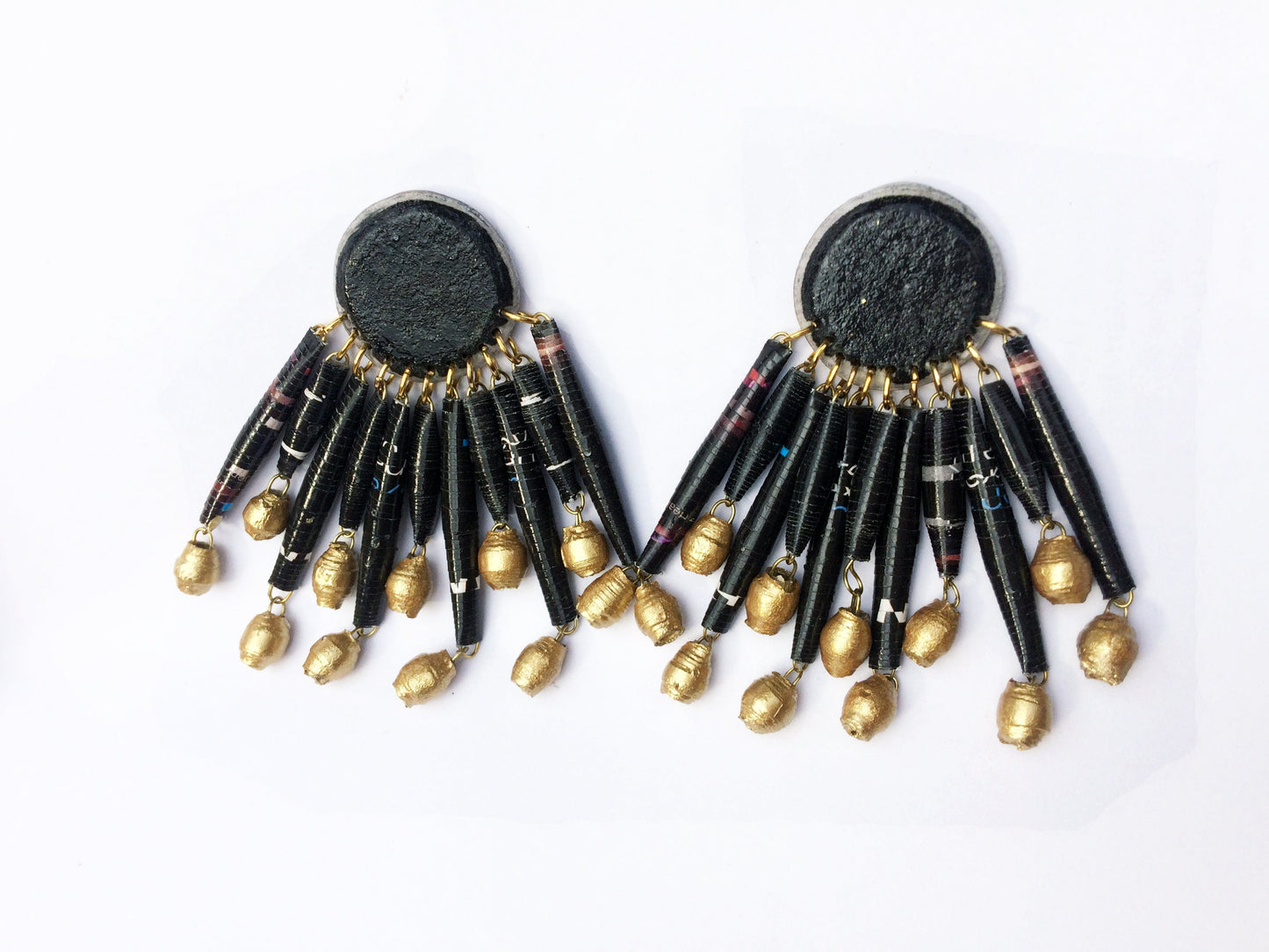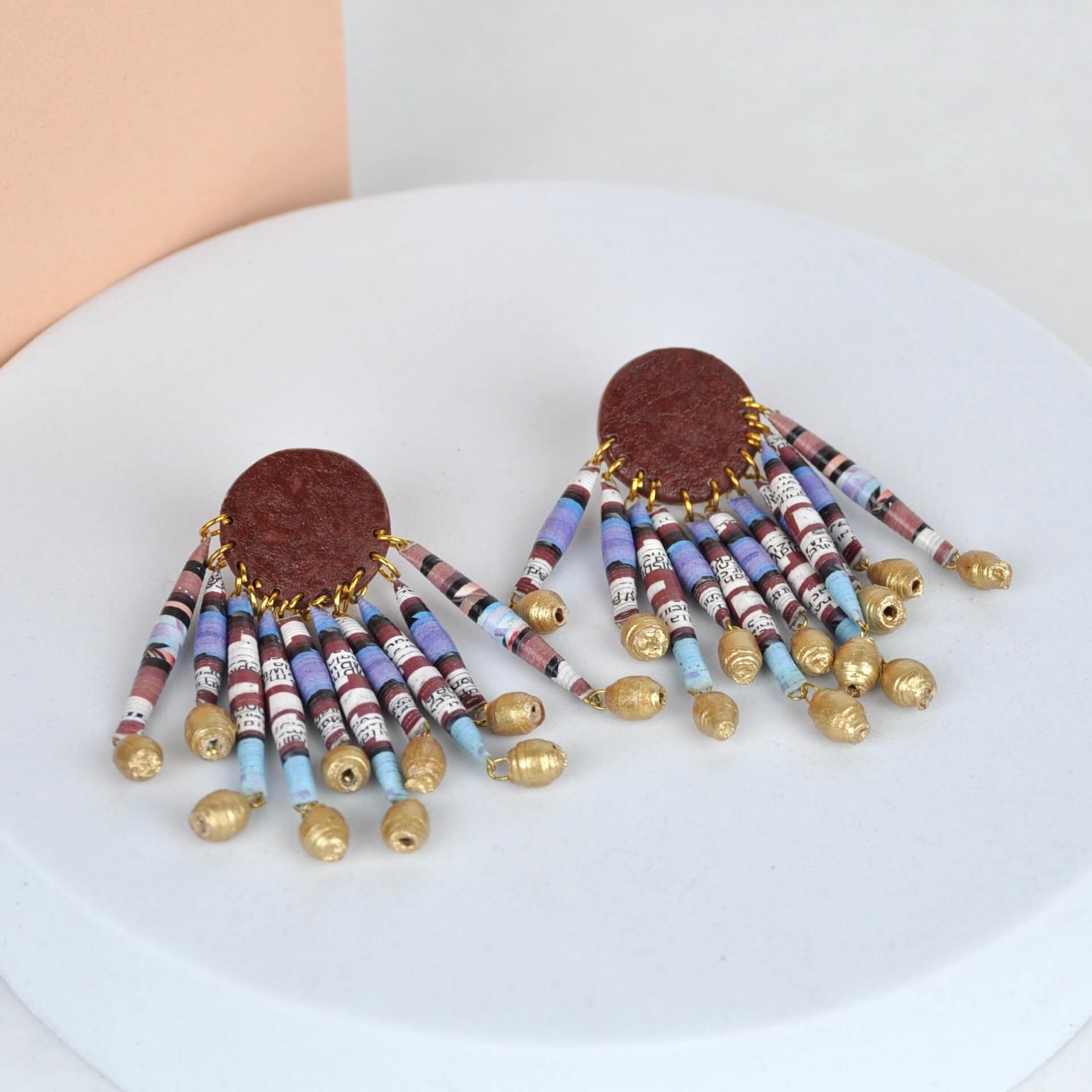 Beautiful handmade paper magazine earrings using Quazi's rolled bead and pulp technique. Using only 100% waste magazine paper and varnished for durability, these unique earrings are made to last.