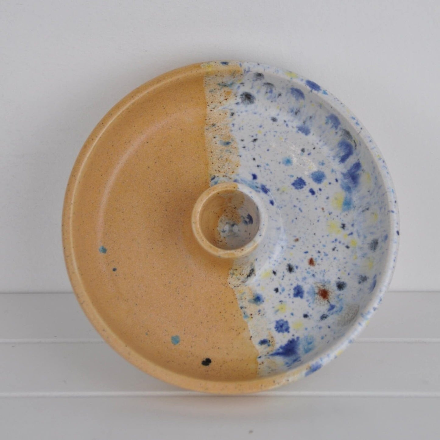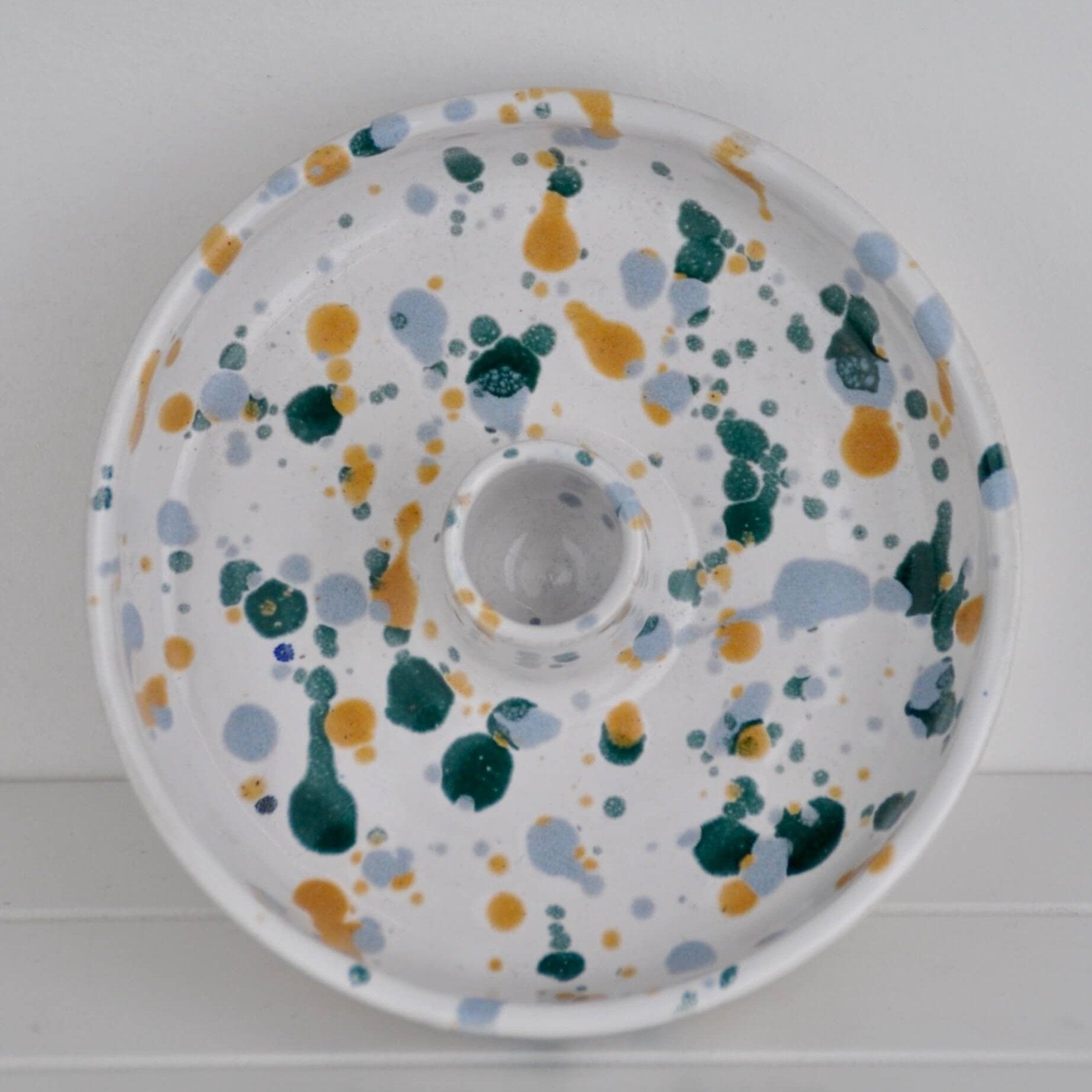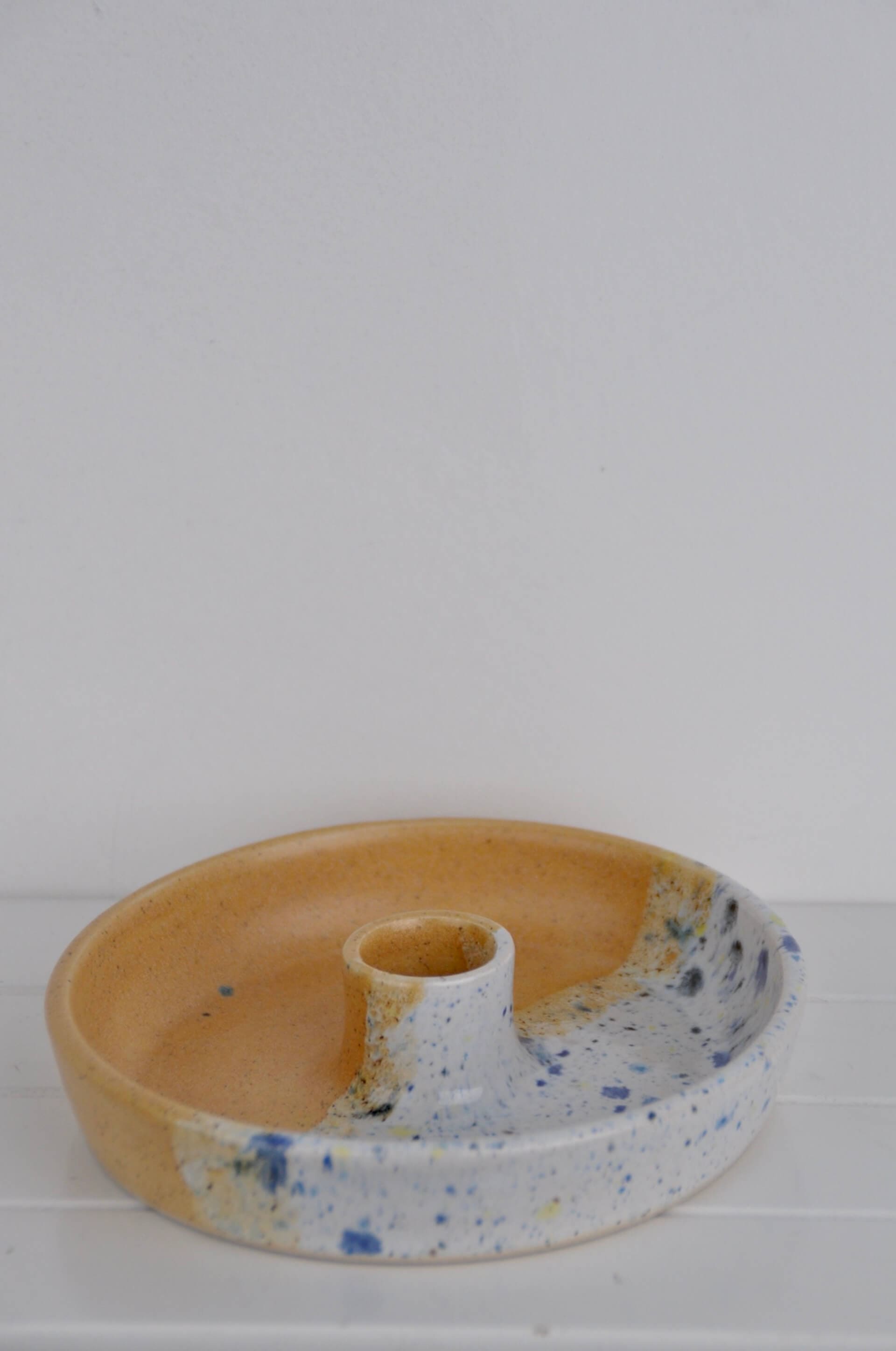 These vibrant stoneware candlestick holders are hand thrown by Edinburgh based artist and designer Ella Fletcher in her converted cow shed studio. They resemble an old fashioned type candlestick holder with a rounded bowl shaped base to catch the wax. Designed with Prior in mind the colours of the glazes are exclusive to us.