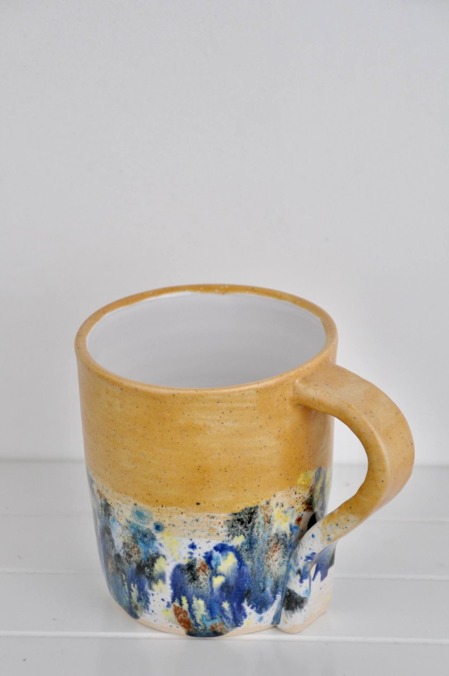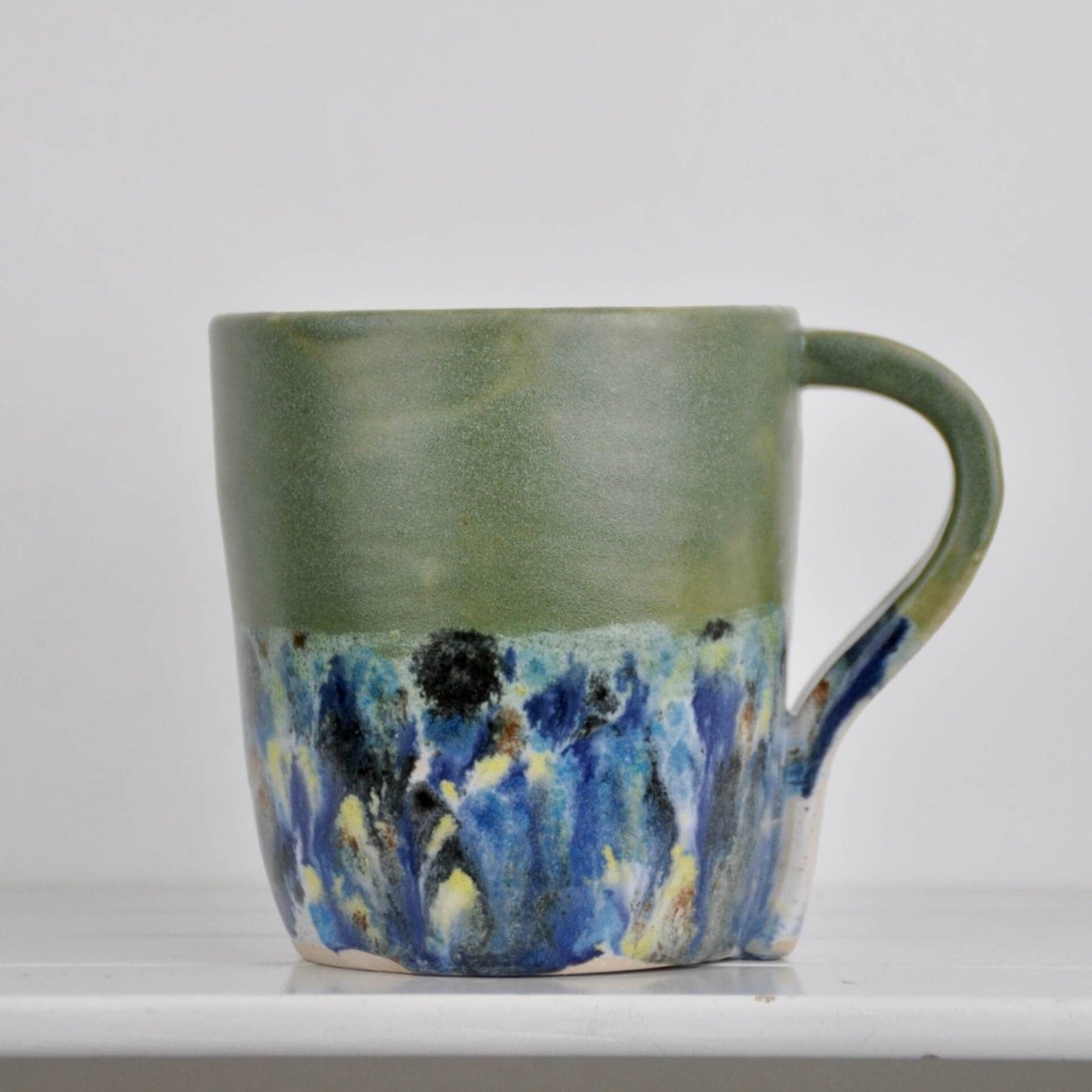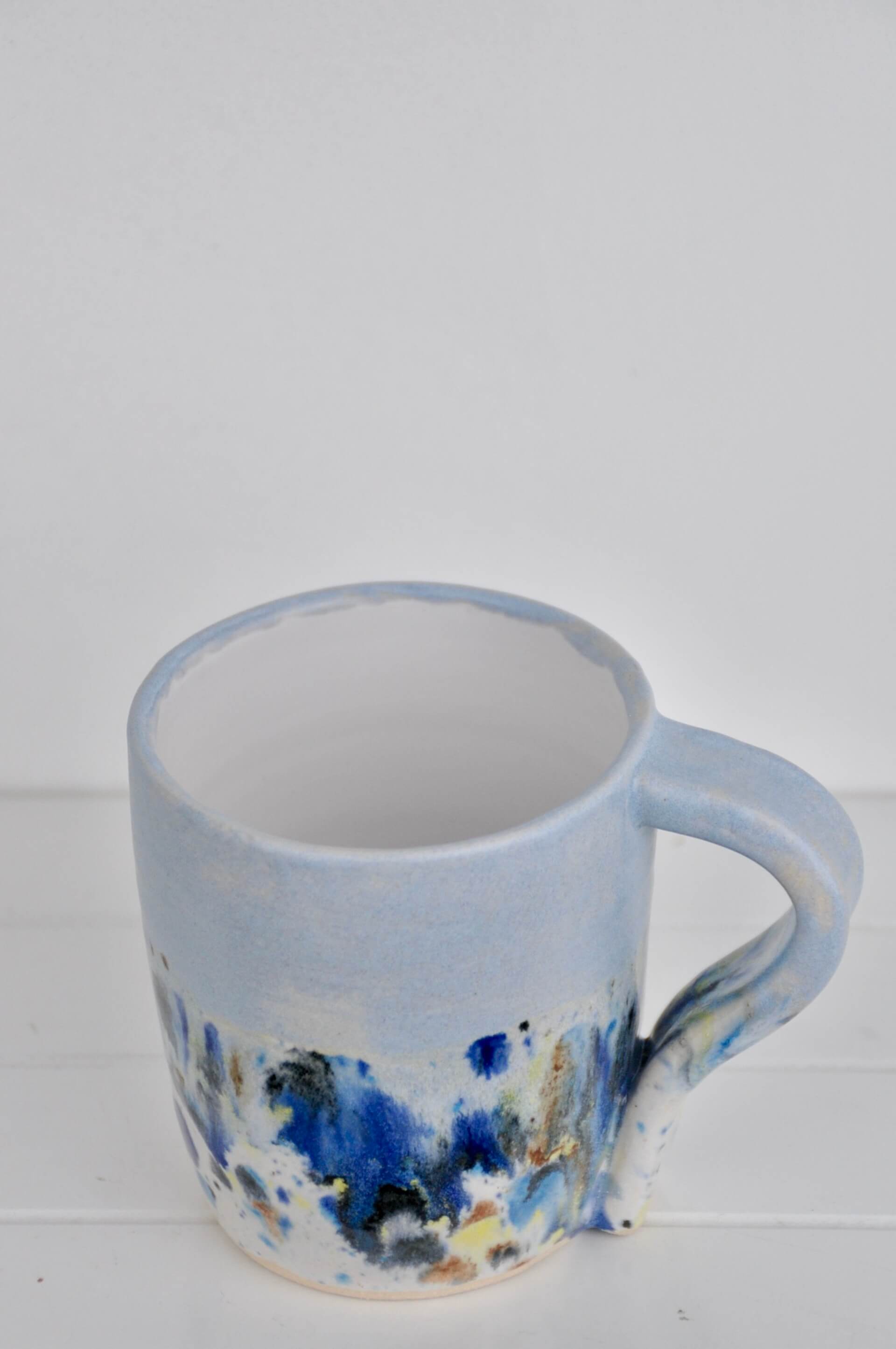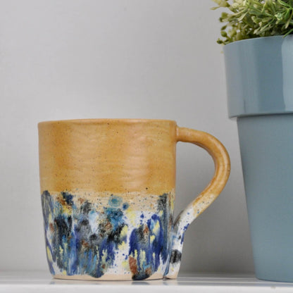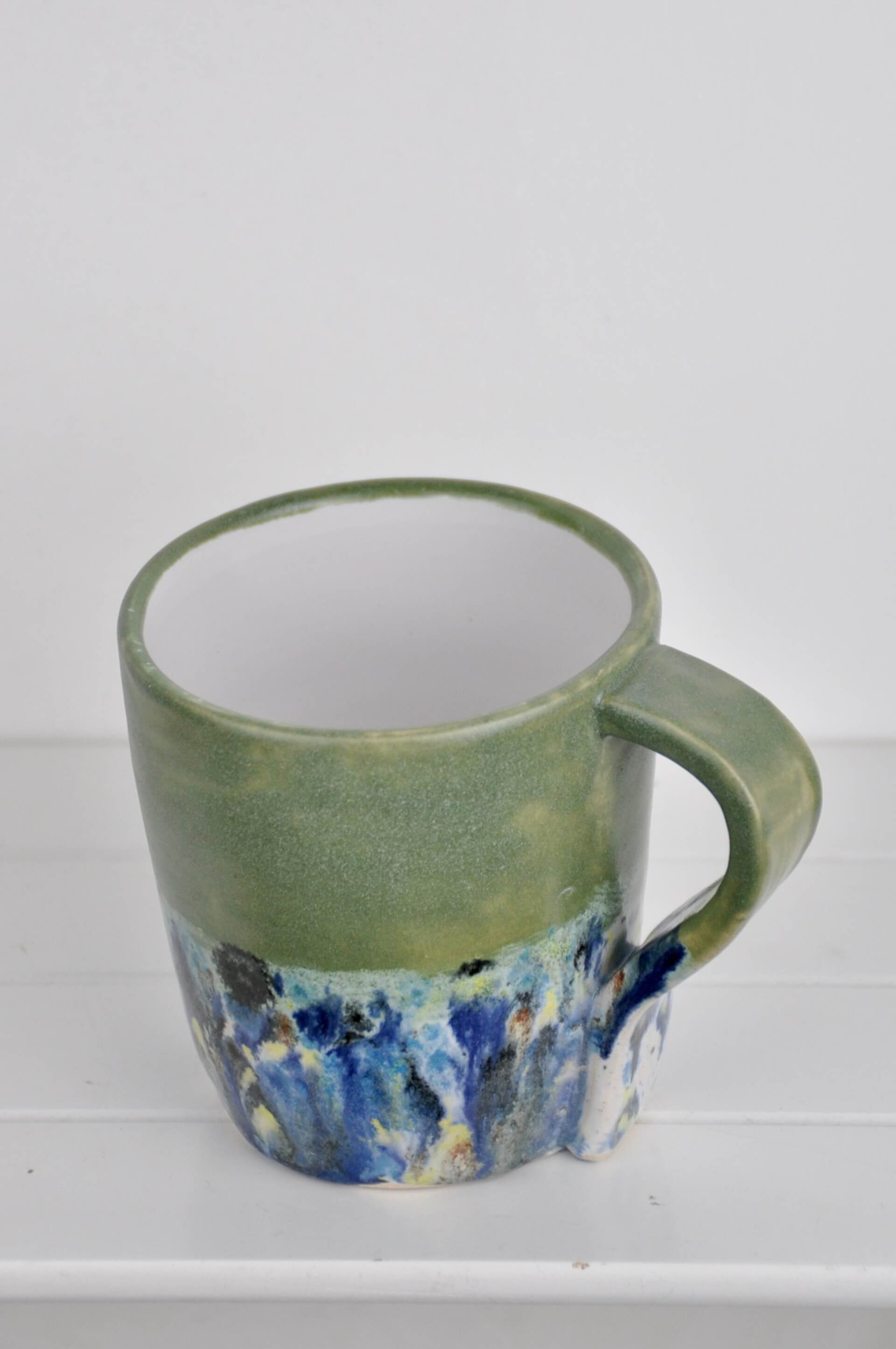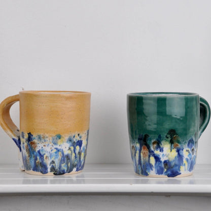 Hand thrown tall ceramic stoneware mugs with a combination glaze, glossy fade of colour reflecting the shoreline of our coastline with white gloss inside. Handmade in Edinburgh in colours especially for Prior Shop - exclusive!