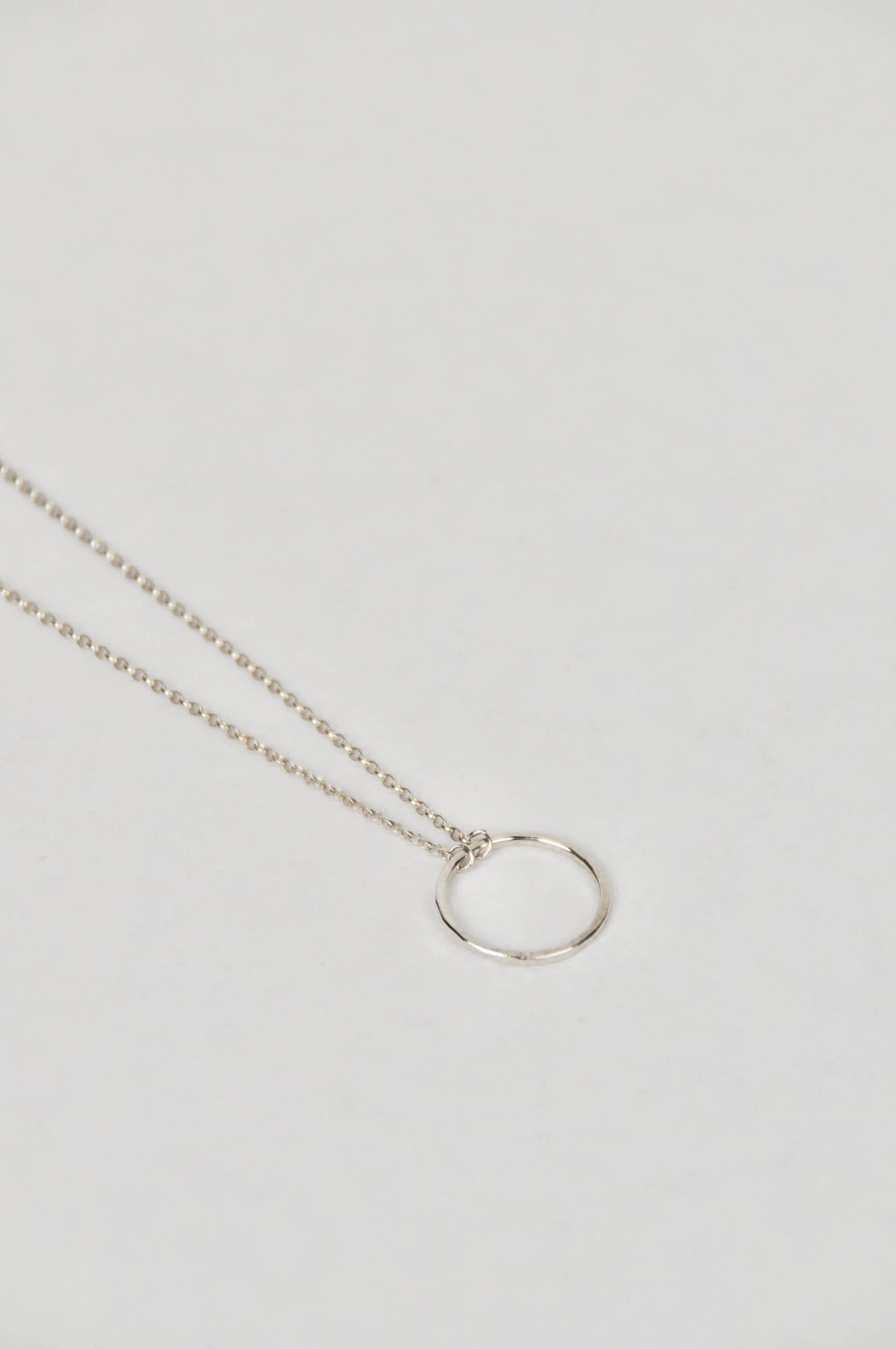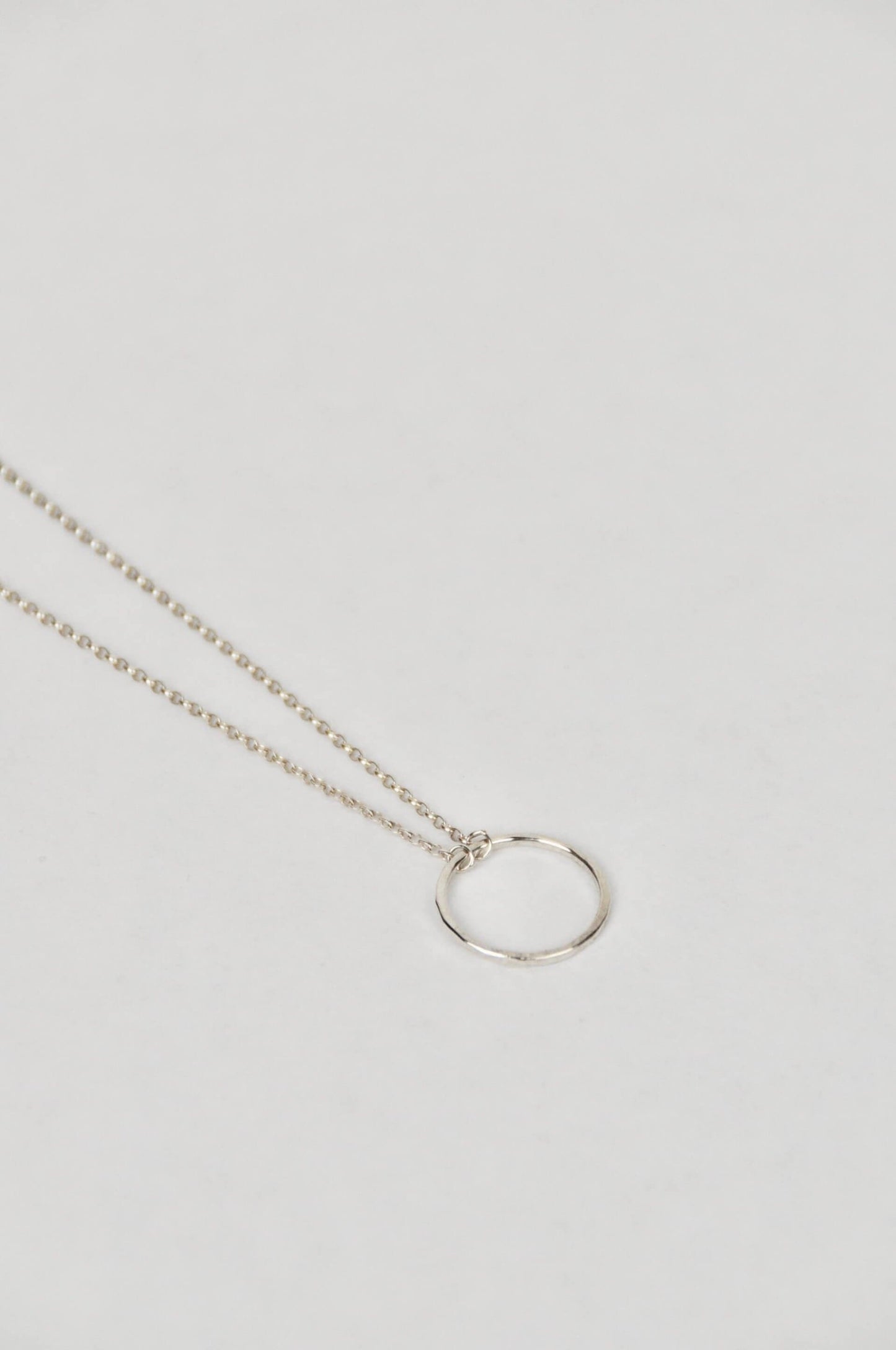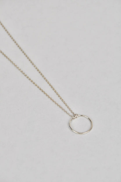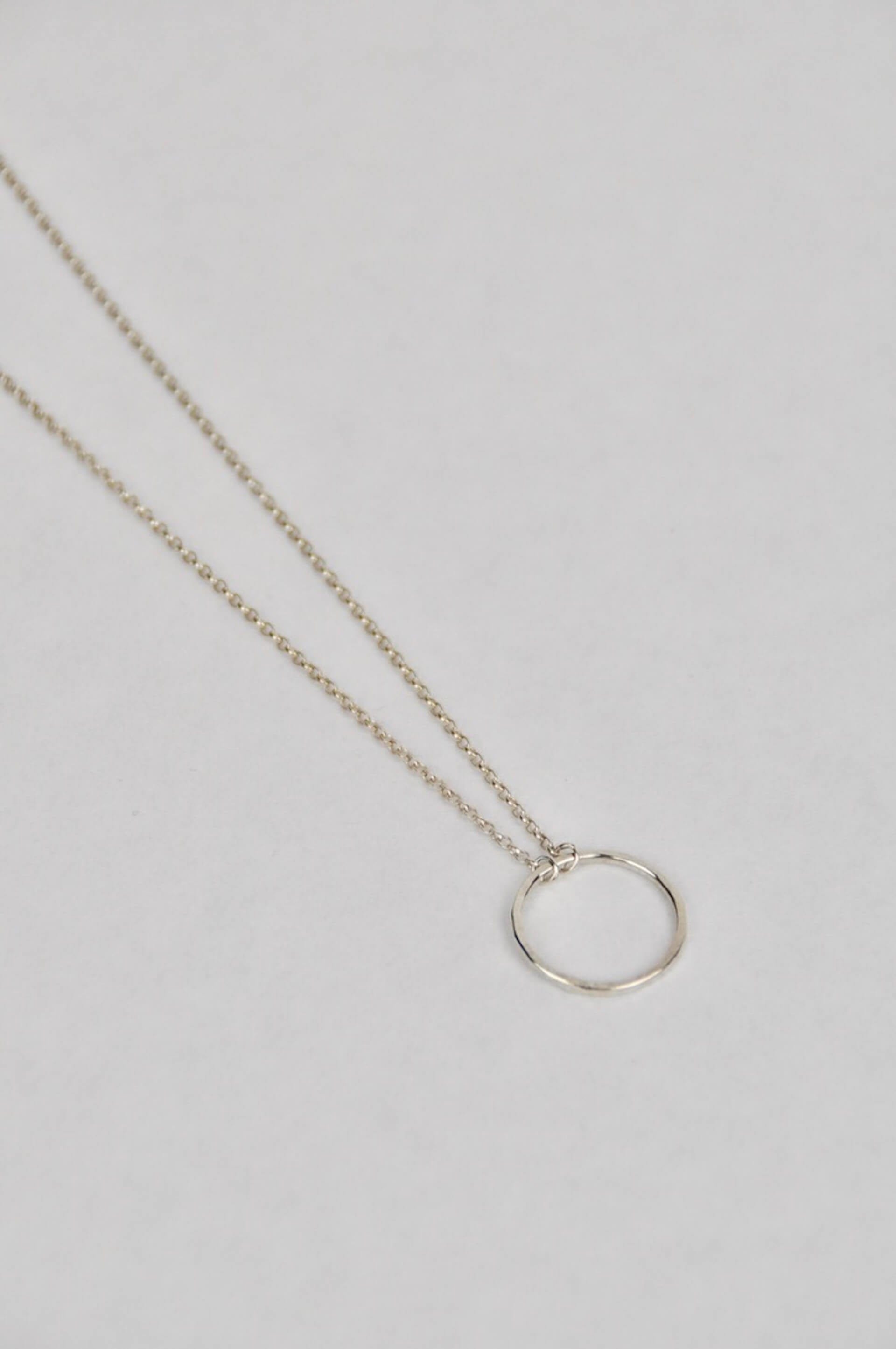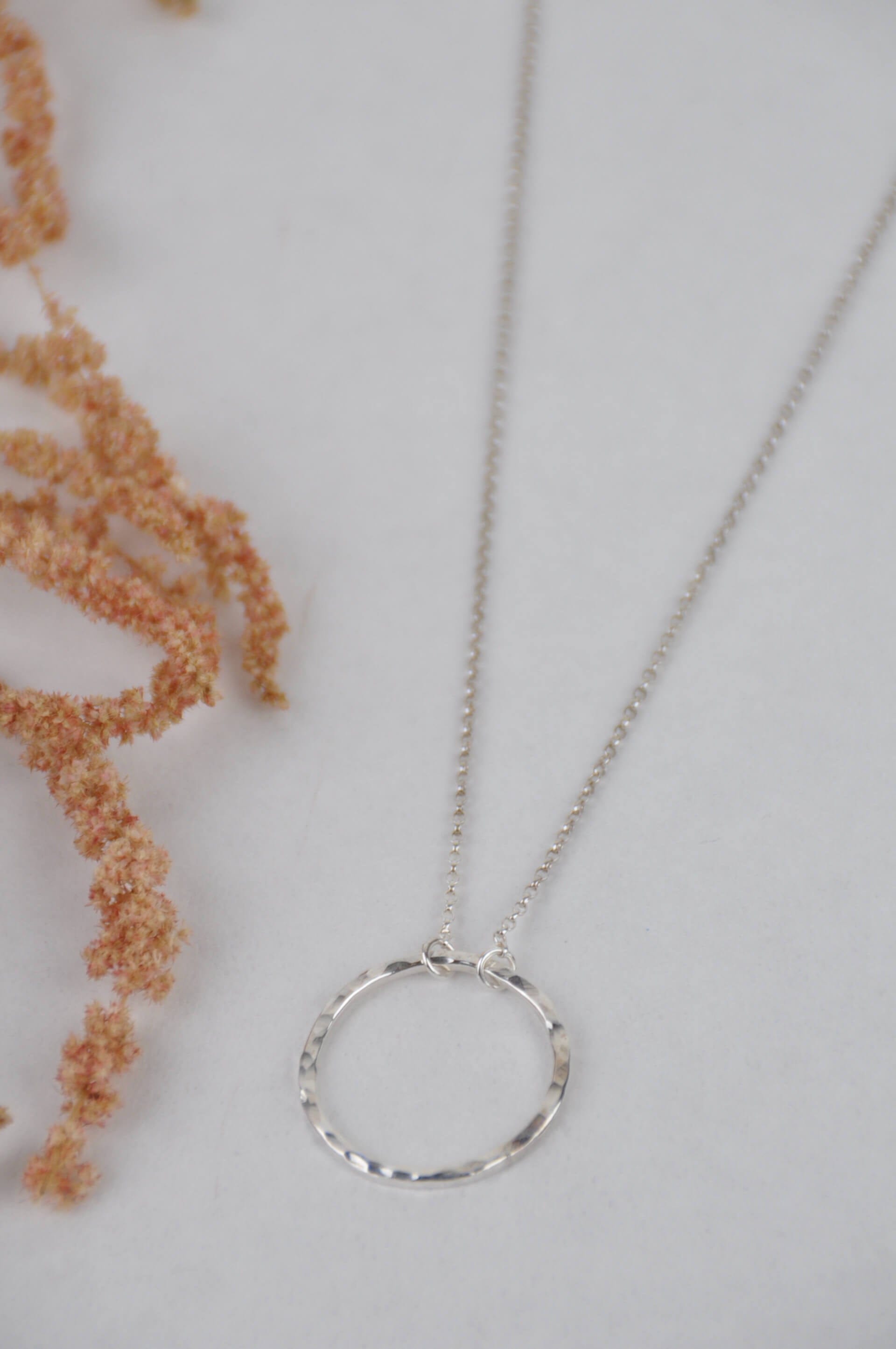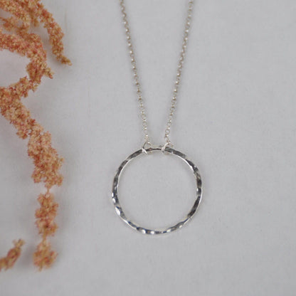 A beautifully designed, elegant single circle pendant in hammered silver on a silver chain.