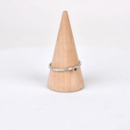 From Clare Lloyd comes this small but mighty stacking ring. The ring is hand-formed and made from eco silver, with a very tiny black circle detail. It can easily be paired with stacking rings, or worn alone for a minimal look.