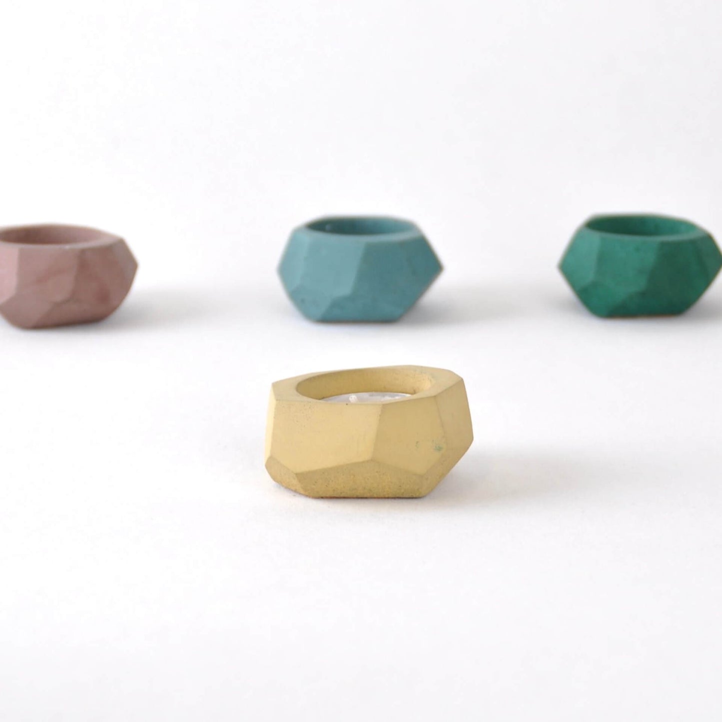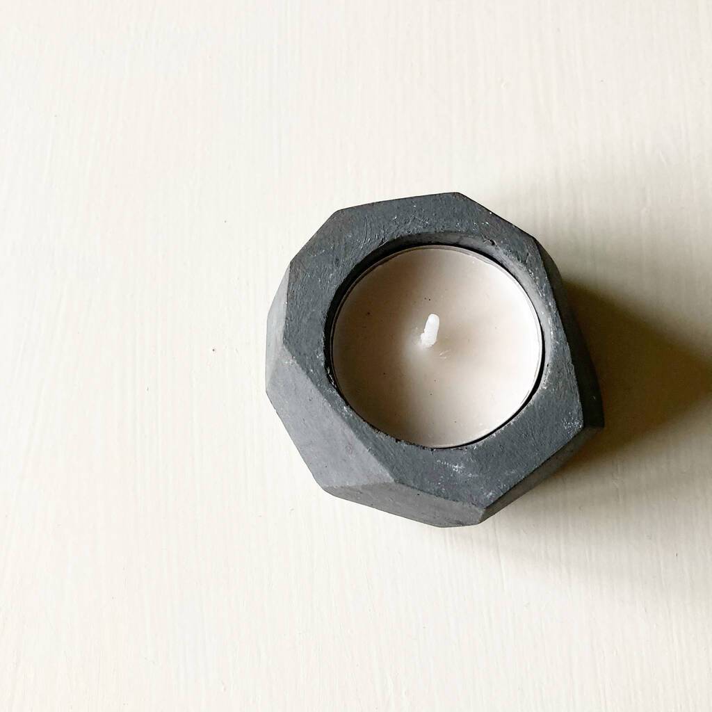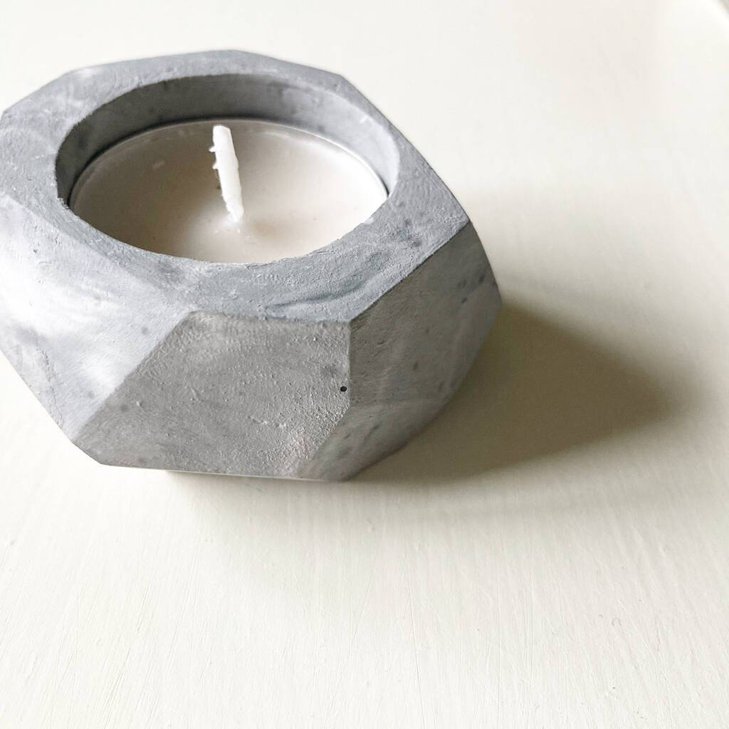 Modern, eco, brutalist tea light holders in a geometric sustainable stone.