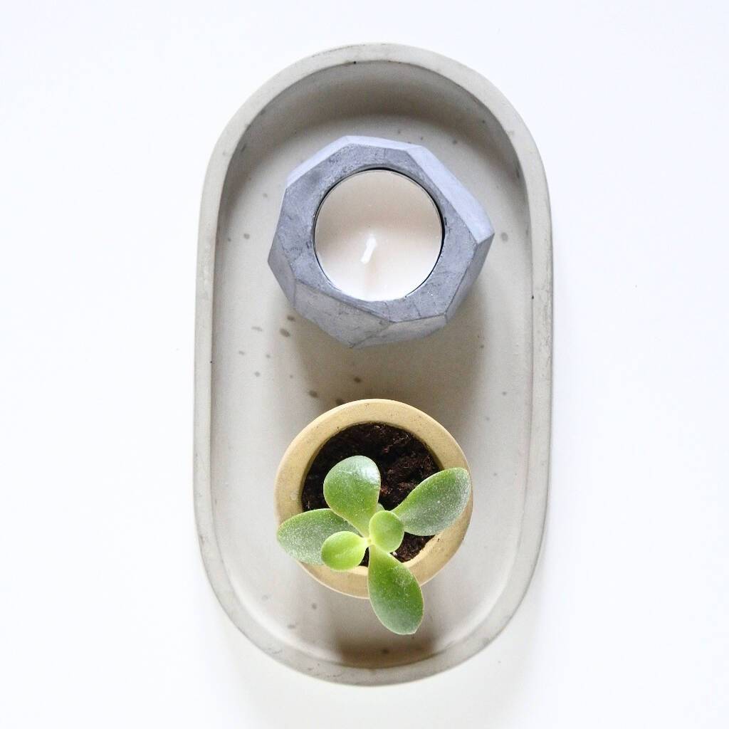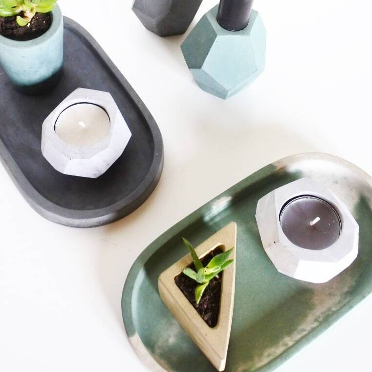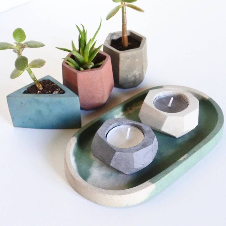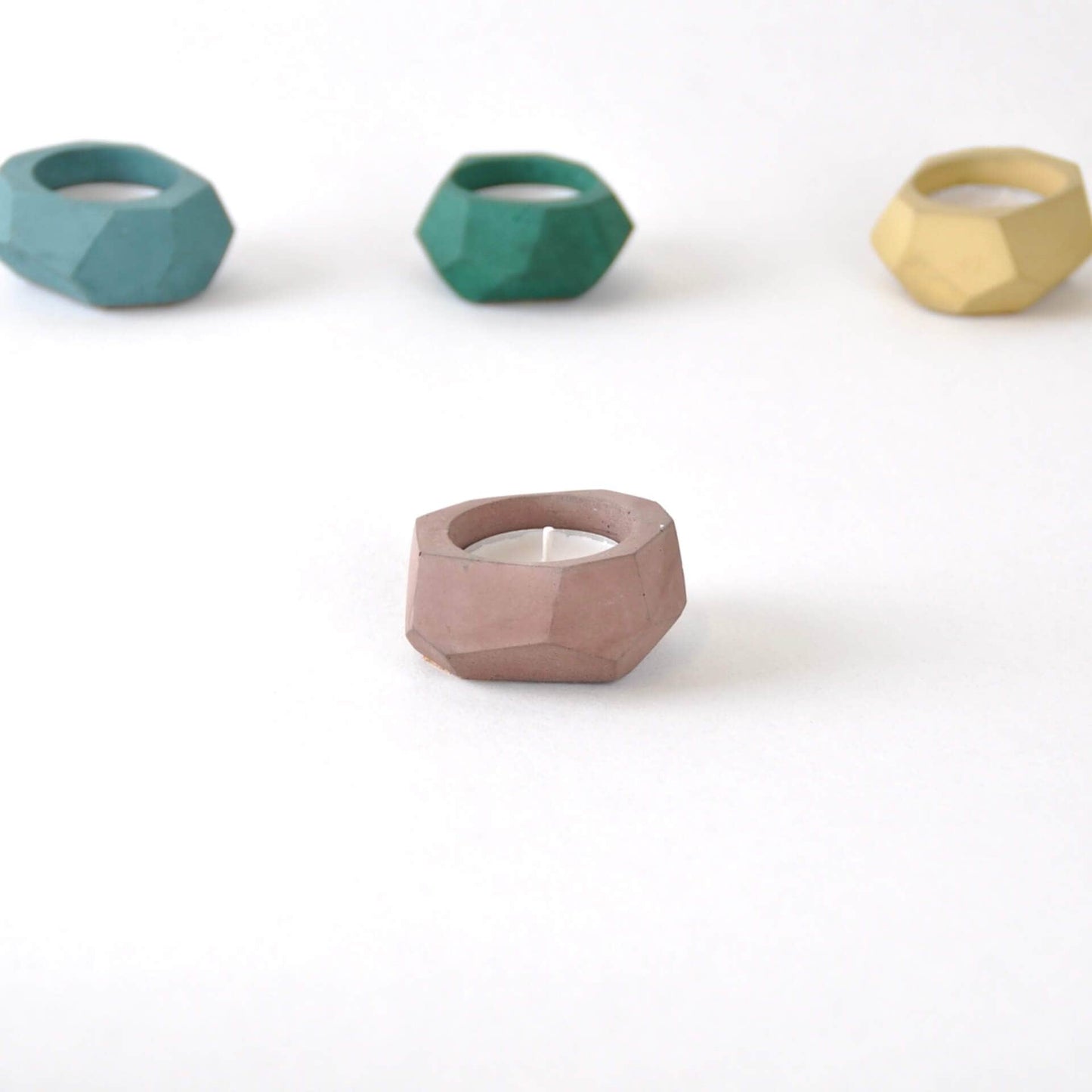 Modern, eco, brutalist tea light holders in a geometric sustainable stone.