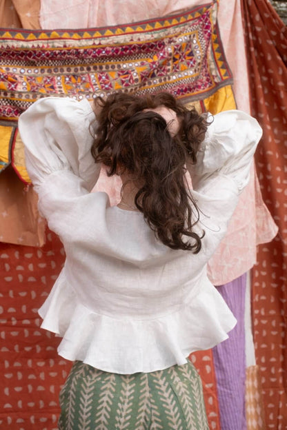 The design brings together soft volume sleeves, tie-up detailing, and a gently flared hem for a flattering fit. Whether worn with high-waisted denim or over a floaty skirt, it’s endlessly versatile – an easy favourite in any sustainable wardrobe.