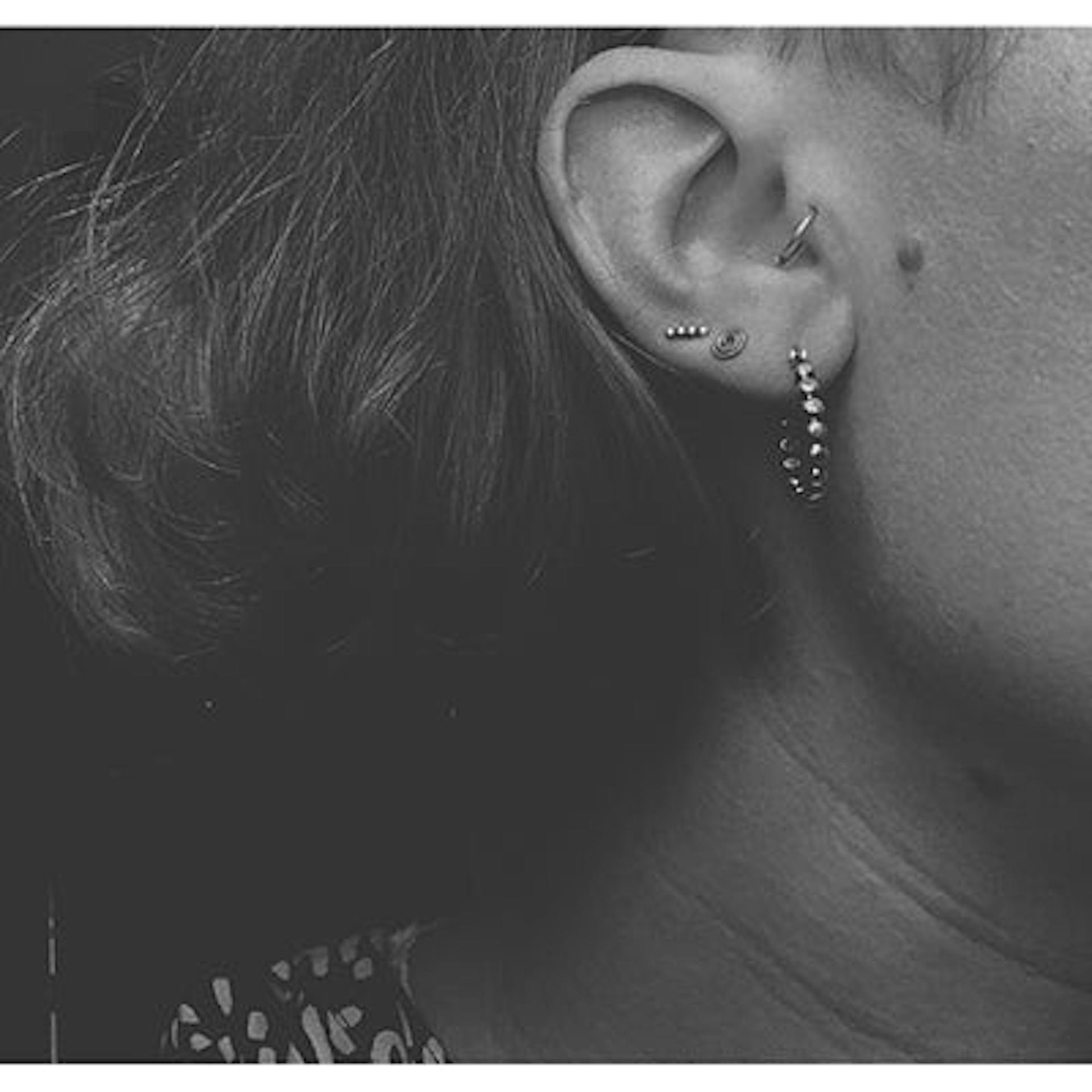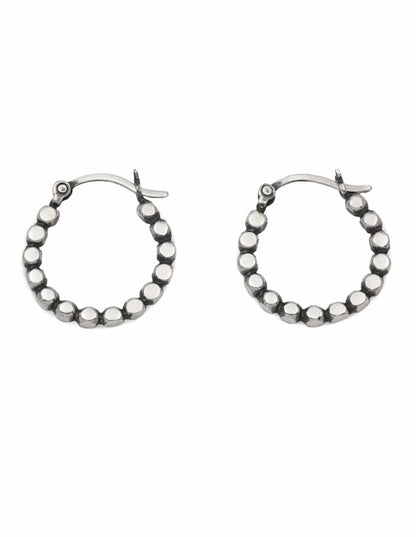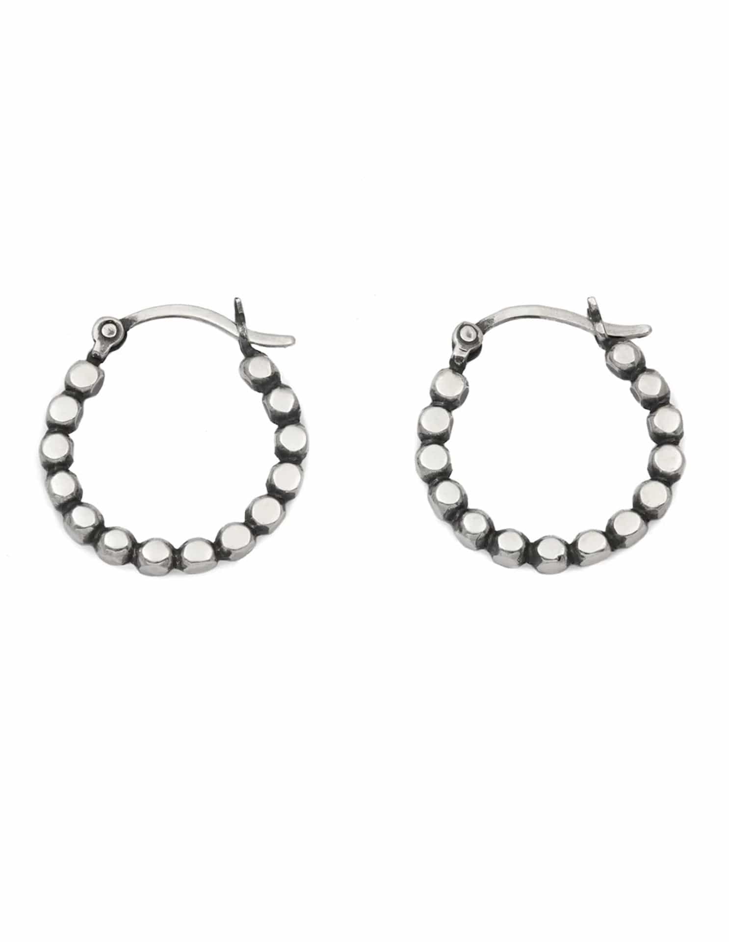 A spin of the classic style hoop, these handmade earrings have been given a modern look by hammering the silver balls to give a square edge. They are designed with a hinged hook and clasp so they are secure, whilst being comfortable to wear and remove.