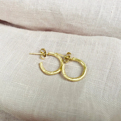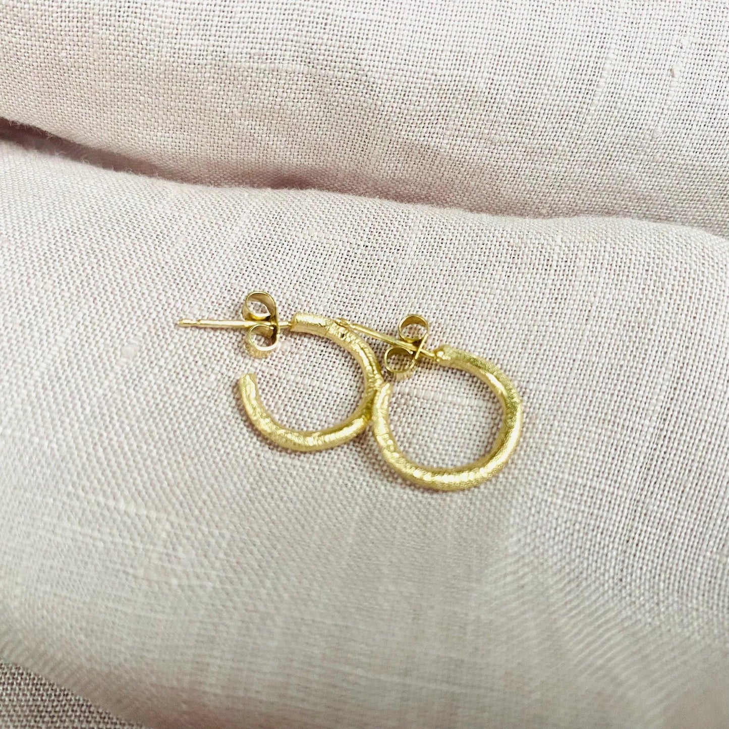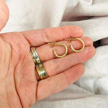 These beautiful handmade earrings are a lovely sustainable accessory to complete a party outfit or to brighten up an everyday outfit. The recycled brass has an organic texture and and has been finished with recycled gold plate to a thickness of 2.5 microns. The texturing process mean each pair is unique, no two pairs will look the same.