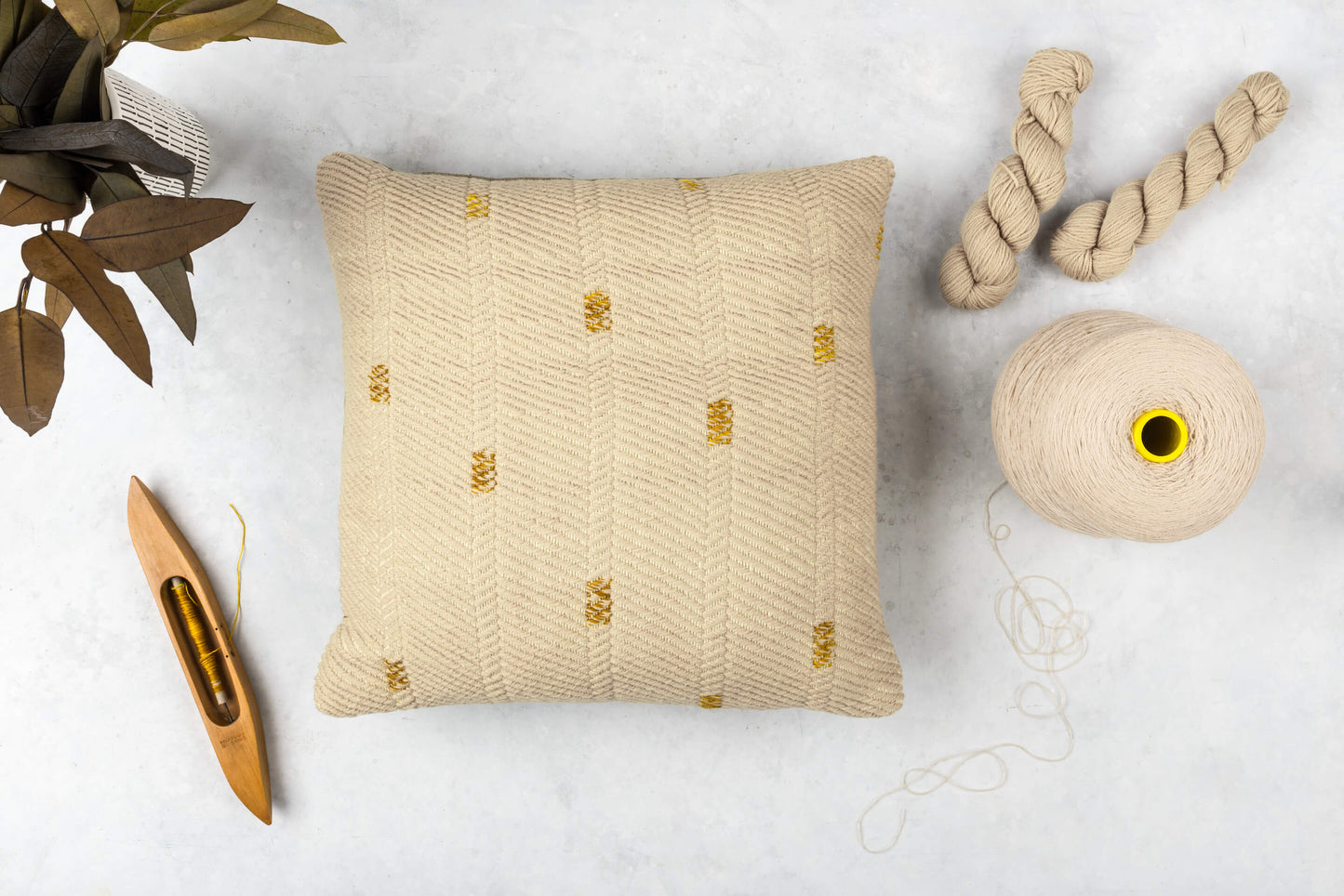 Add texture, softness and style to your sofa, chair or bed with this hand hand-woven cream with flecks of mustard cushion. Each cushion is one of a kind and will radiate the warmth, care and skill that was woven into it by Hilda from Honest Weaves.