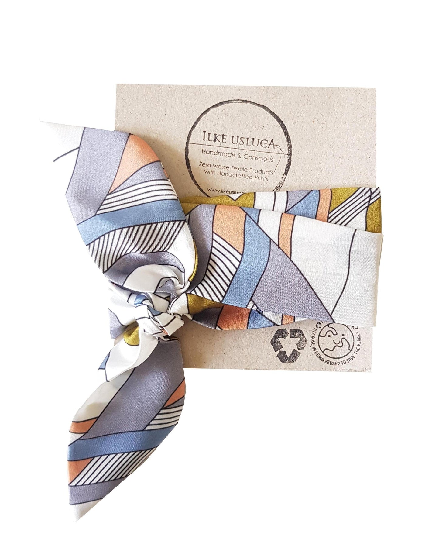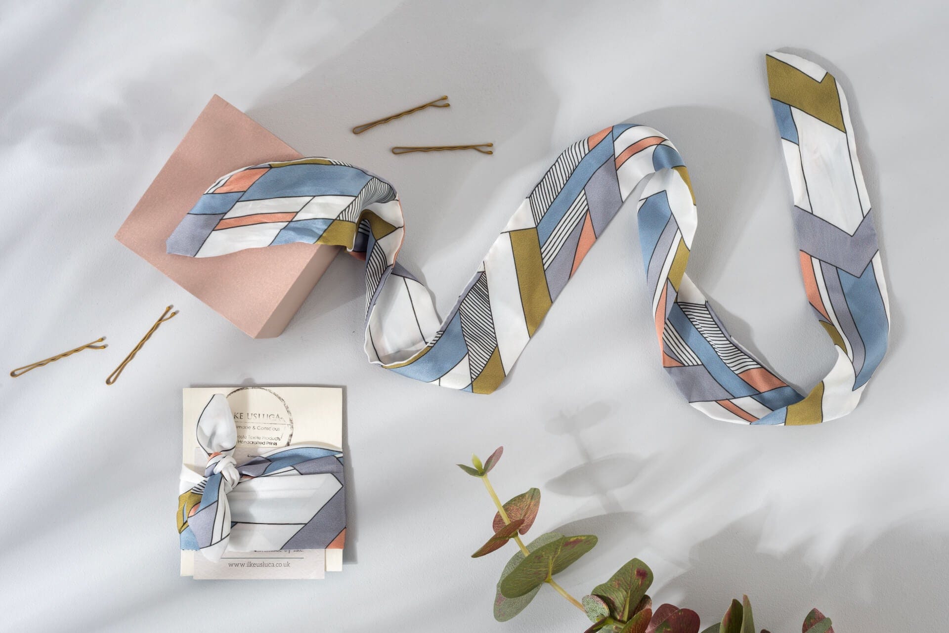 A satin headscarf in Ilke's classic hand-drawn 'Sky' print which is a beautiful pattern with blue, grey, salmon and moss green tones. Perfect for fixing hair, wearing as a headscarf, or tying to a bag for a chic look.