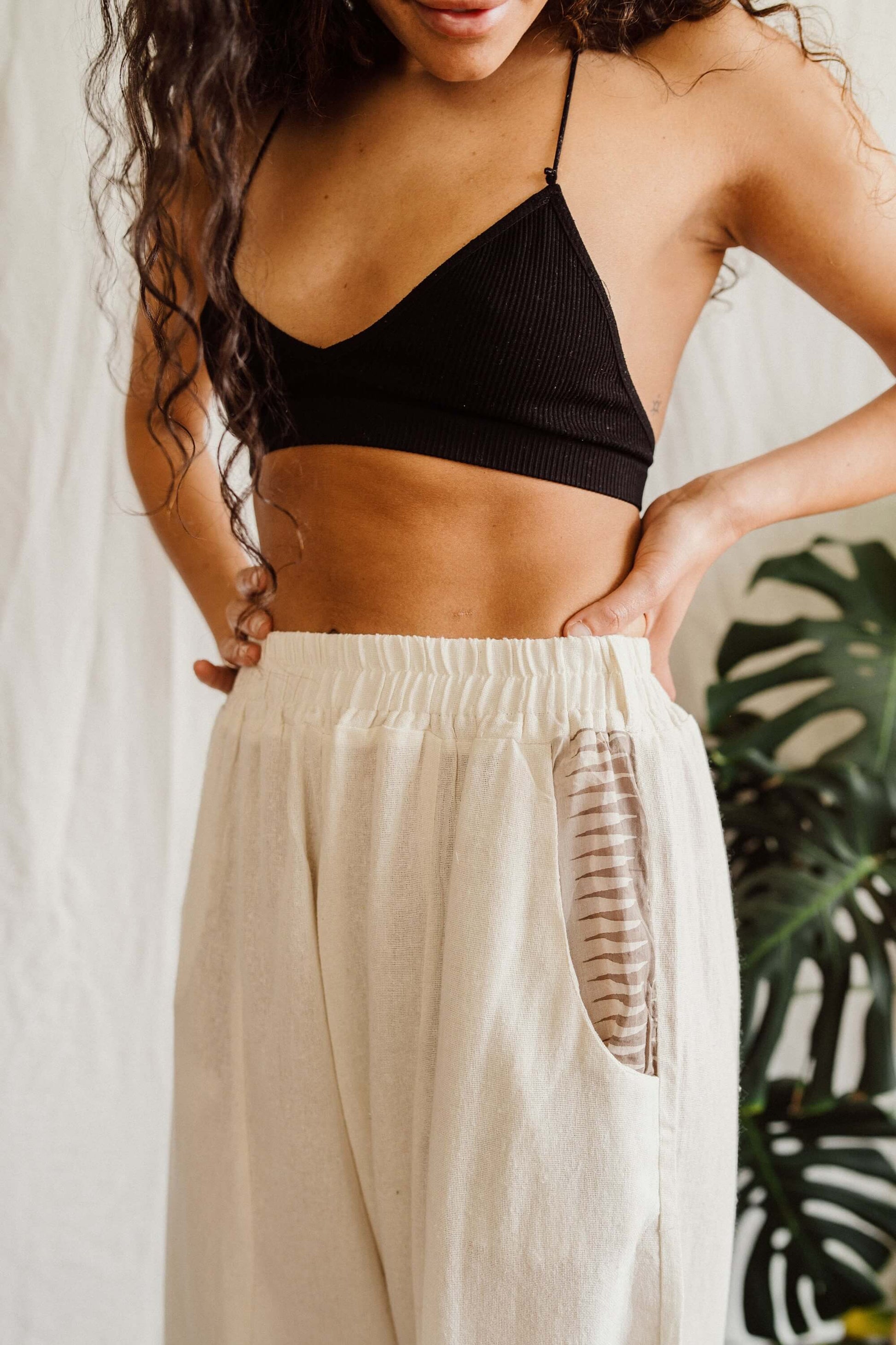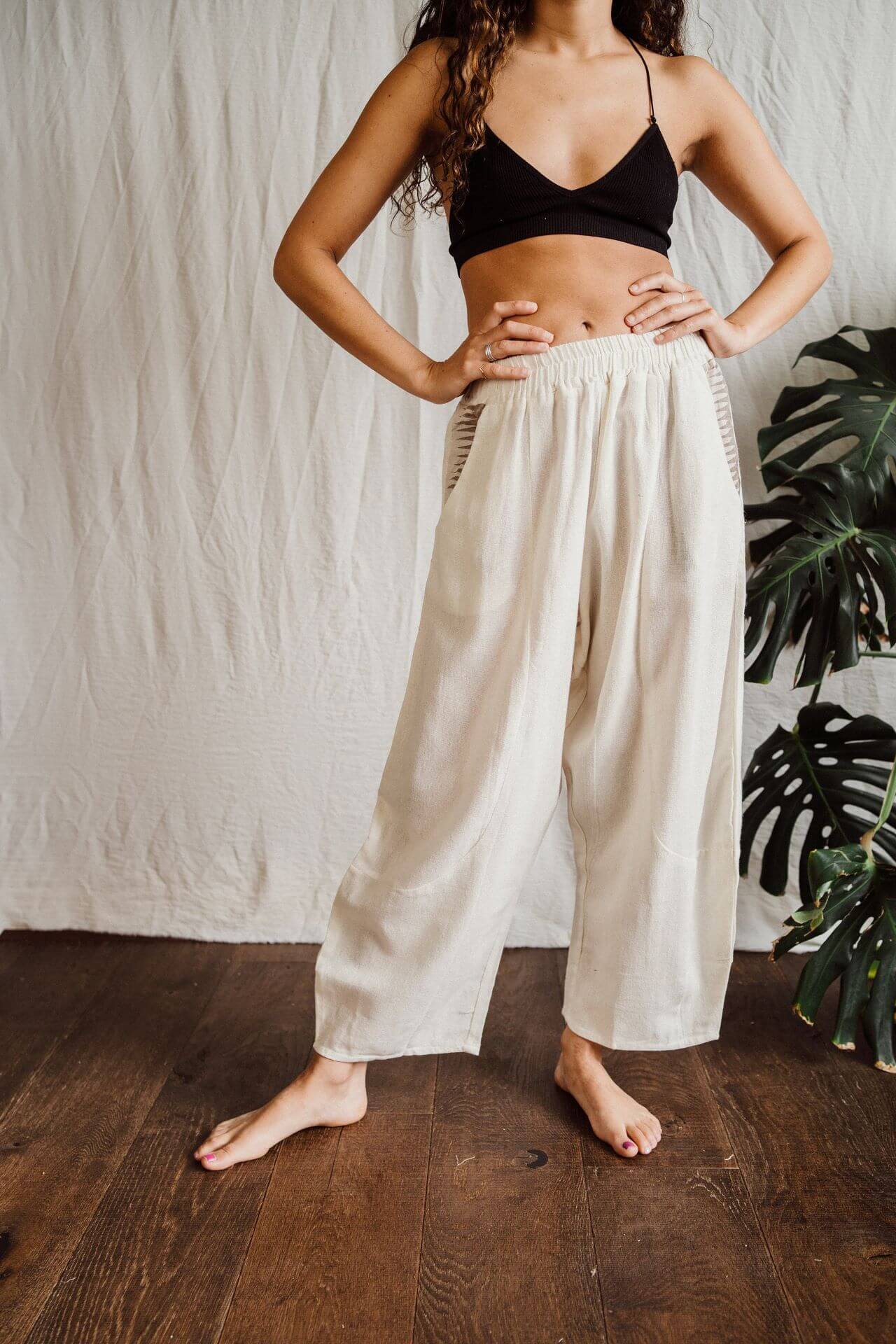 Comfy and cosy natural cotton harem trousers with patterned pocket detailing.