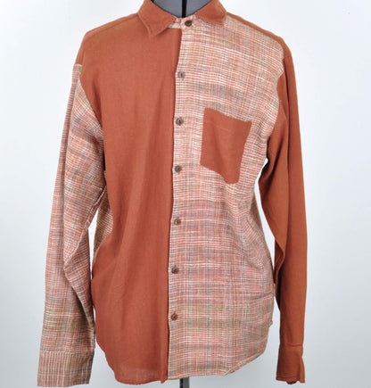Relaxed shirt with a contrasting body and sleeves. The solid colour is in a gorgeous autumnal rust, and the contrast material has a similar mix of autumnal colours, the weave clearly exposing the thicker fibres, giving it a beautiful texture.