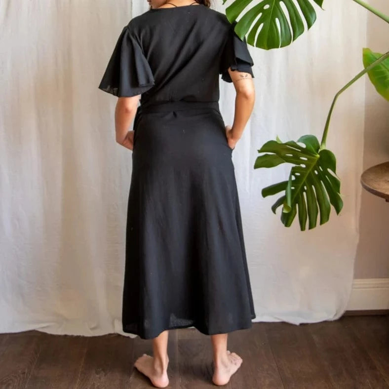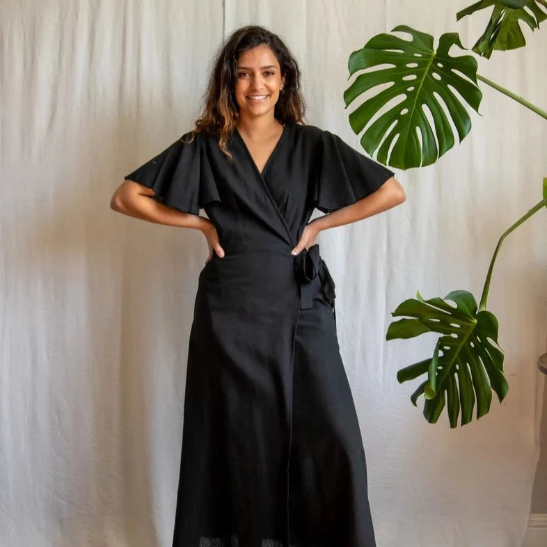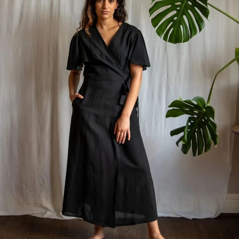 This beautifully-made wrap dress is the ideal addition to your eco-wardrobe. Made from earth-friendly linen fabric, and featuring a flattering and chic wrap style, this dress will be your go-to outfit for weddings, events, (or just the farmer's market) in no time.