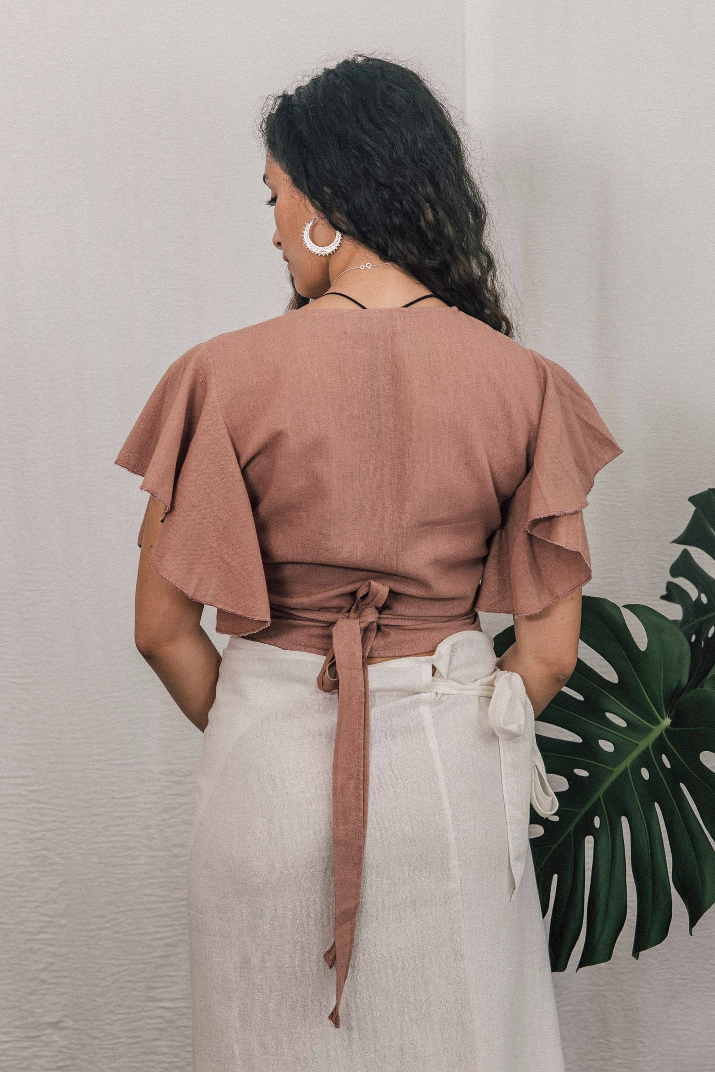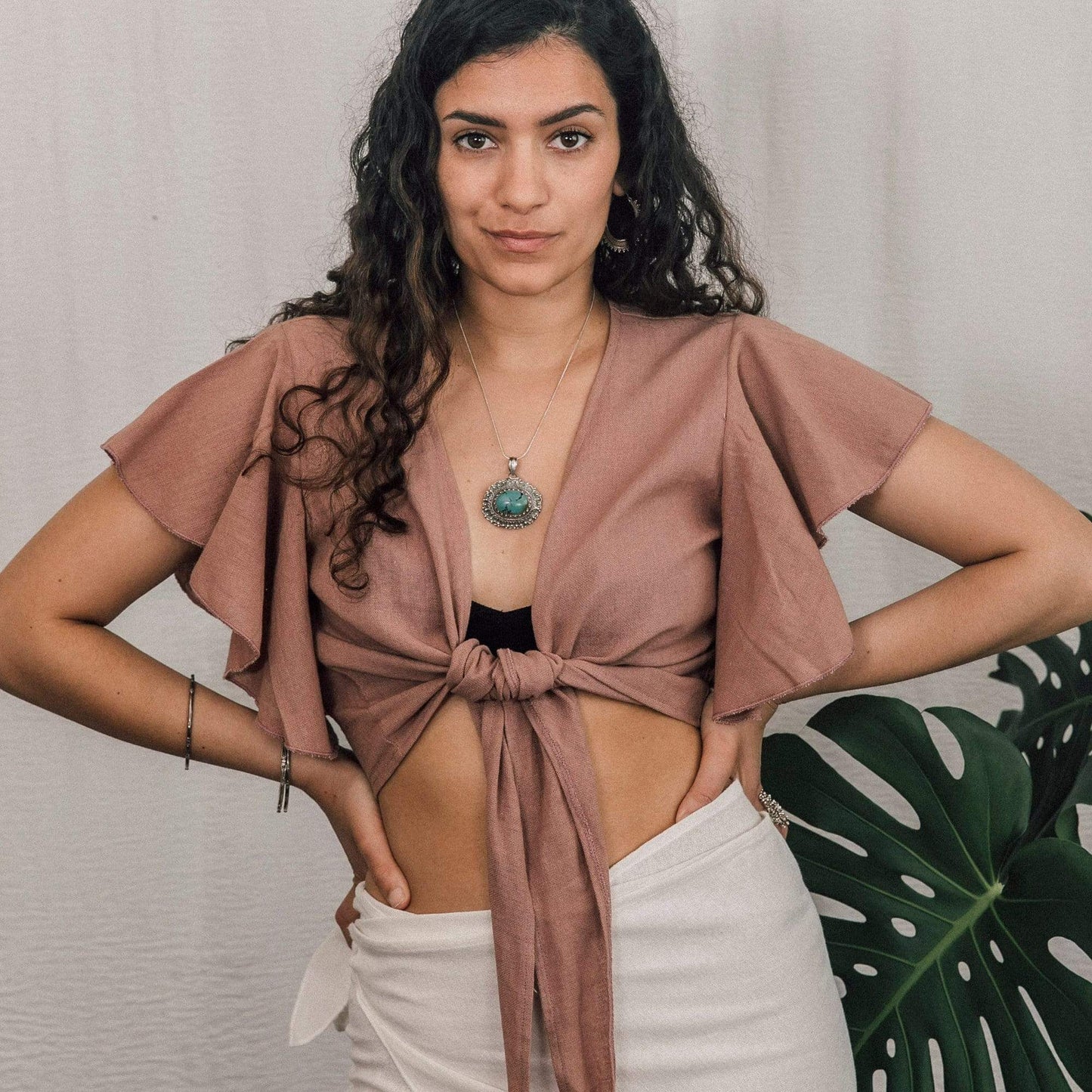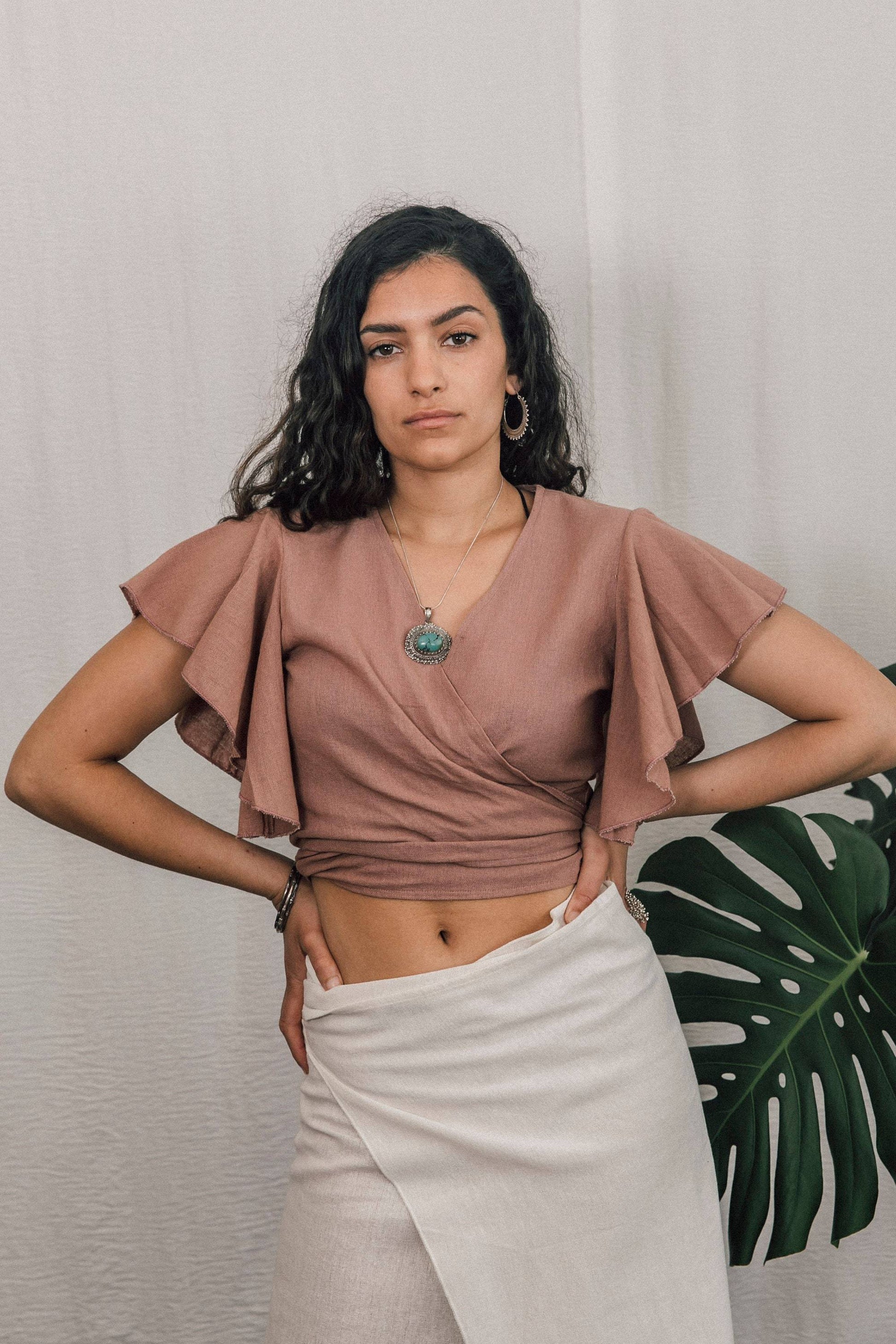 Delightful flowing ballerina-style wrap top in a calming dusty pink, perfect for dressing up or down, from beach to cocktail bar.