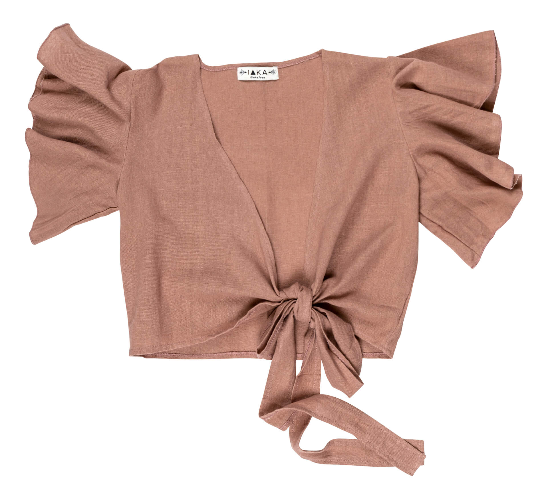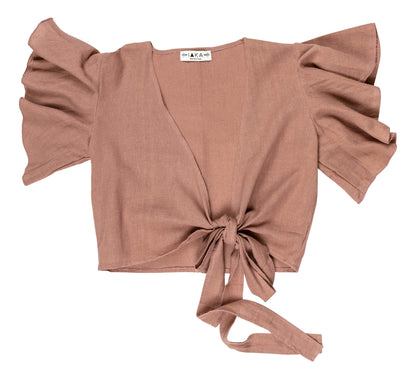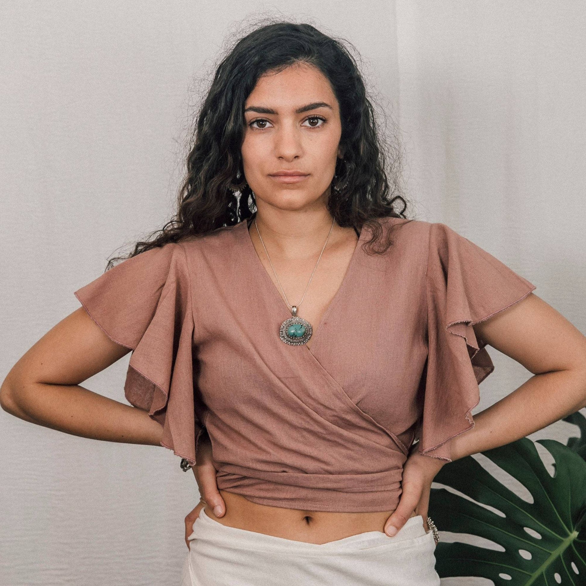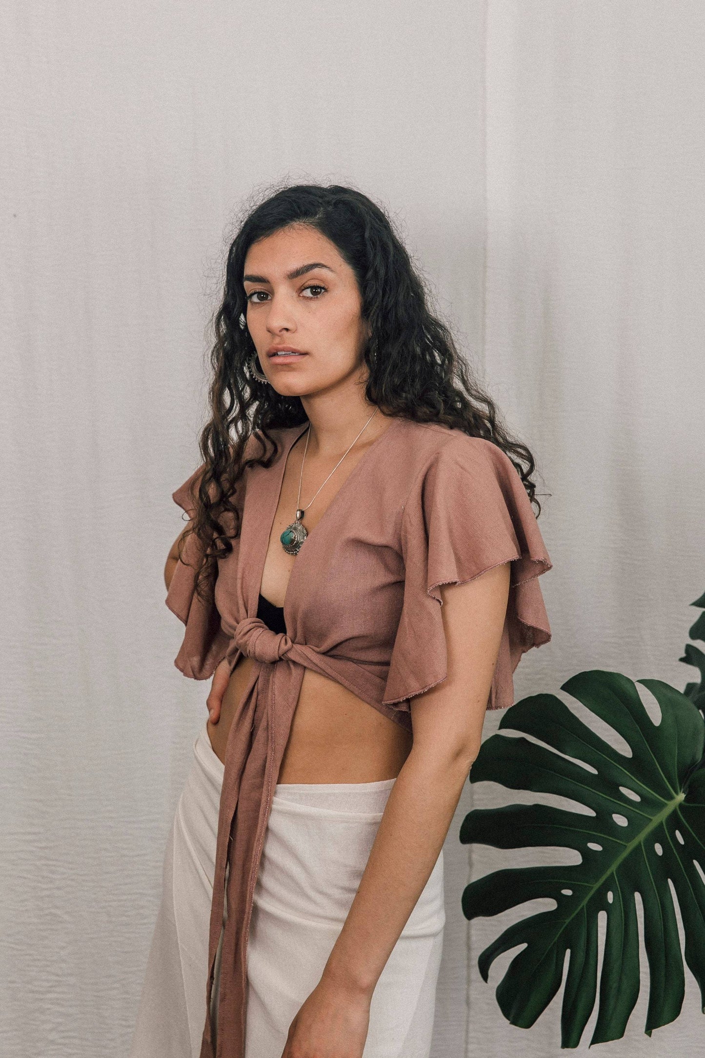 Delightful flowing ballerina-style wrap top in a calming dusty pink, perfect for dressing up or down, from beach to cocktail bar.