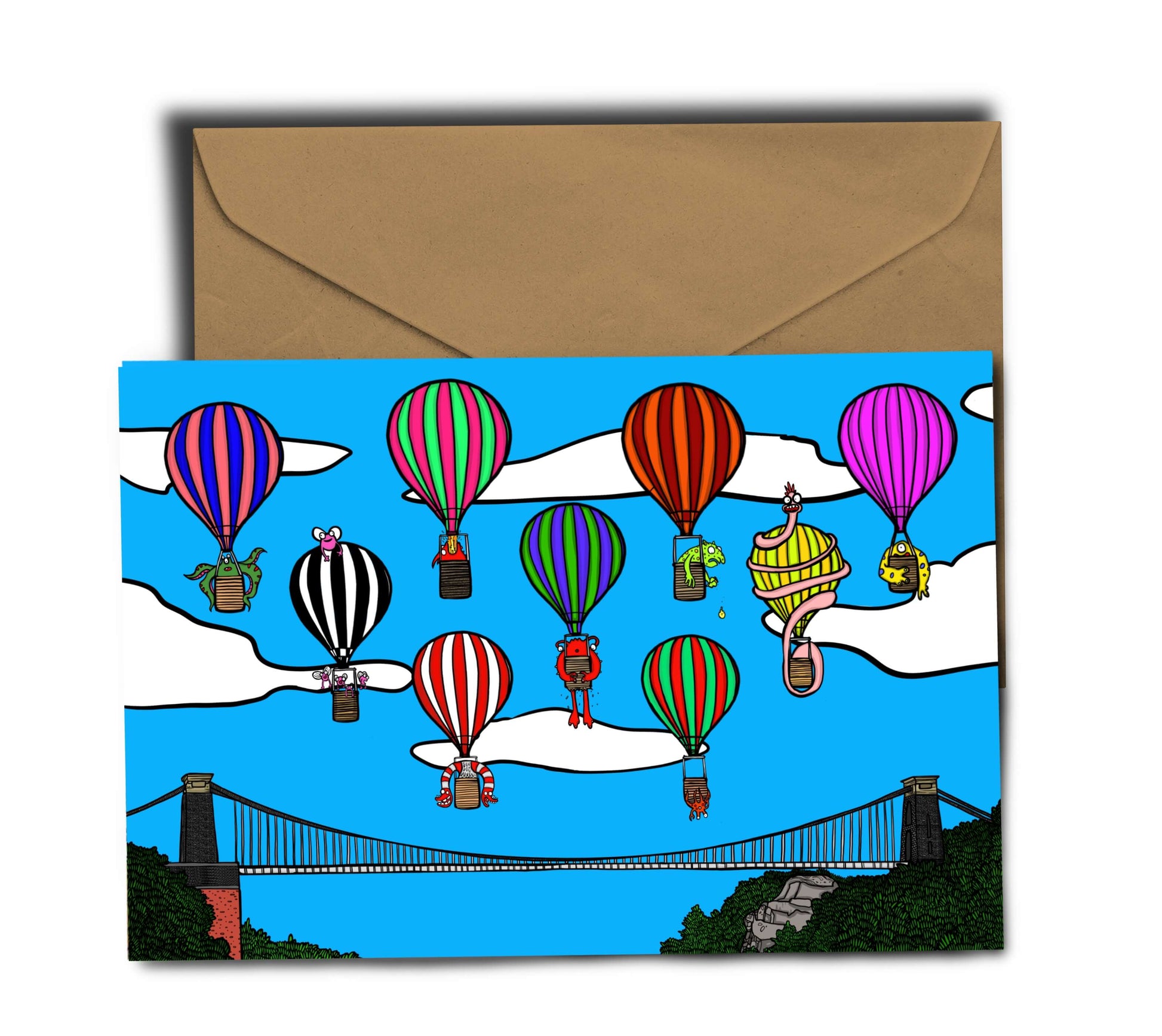Dixon Does Doodles’ Monster Balloons Clifton Suspension Bridge greeting card takes a unique and imaginative spin on the Bristol Balloon Fiesta, one of the city's most cherished events, which celebrates the breathtaking sight of hundreds of hot air balloons filling the sky each year. While the real Balloon Fiesta is filled with graceful, colorful hot air balloons floating peacefully over the city, Dixon adds a fun, playful twist by swapping traditional balloon designs for quirky, larger-than-life "monster" balloons that bring a sense of whimsy and fantasy to the scene.