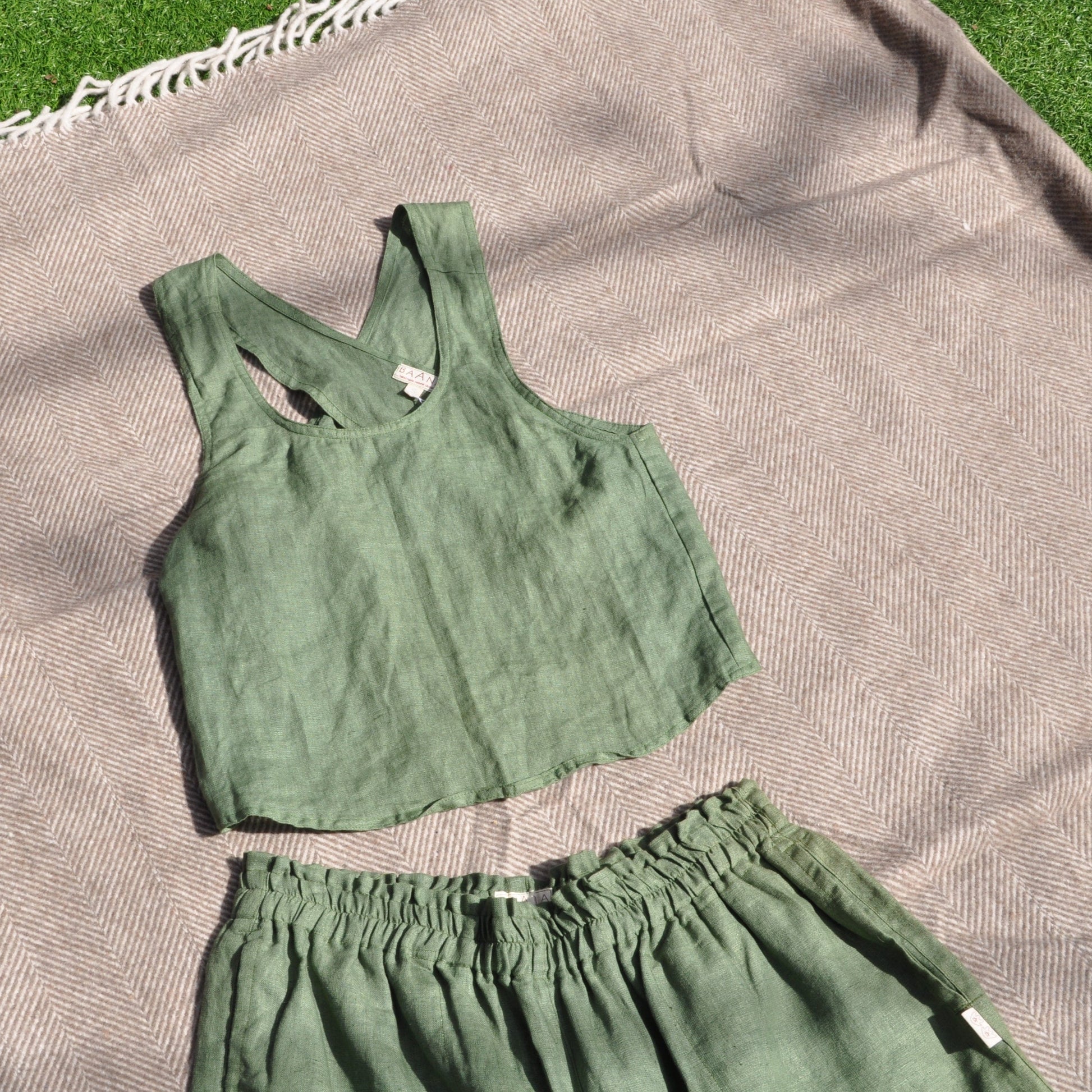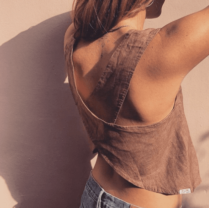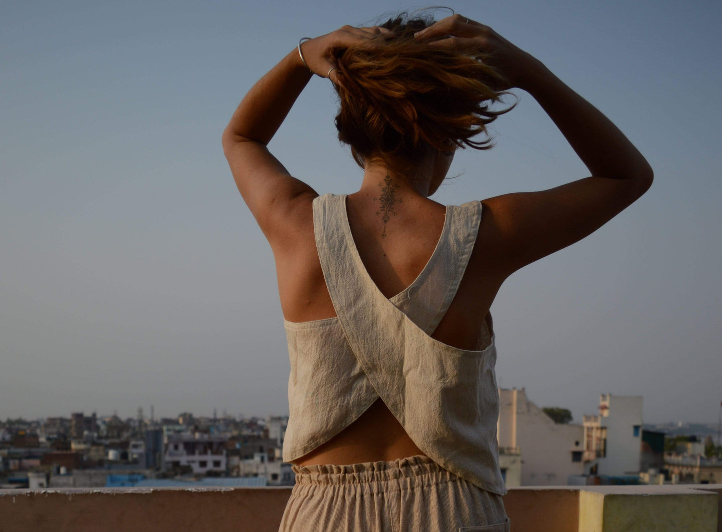 Handmade from 100% Natural Linen, featuring an elegant cross-back design, the Pini top is loose-fitting for maximum comfort and breathability. The front features a simple, universally-flattering scoop neck.