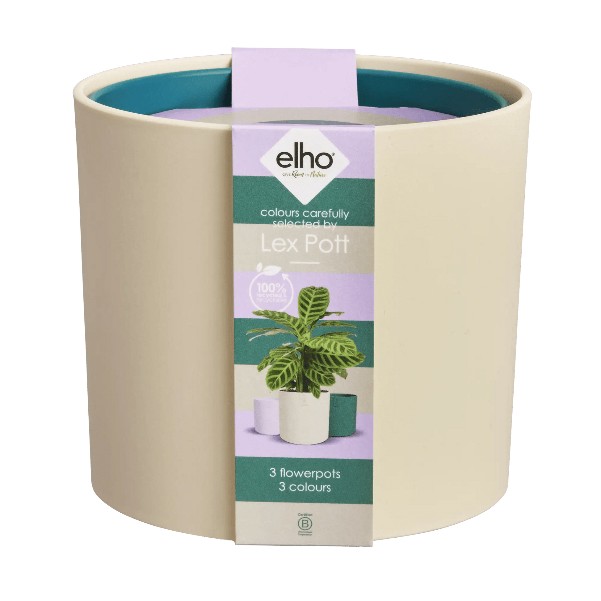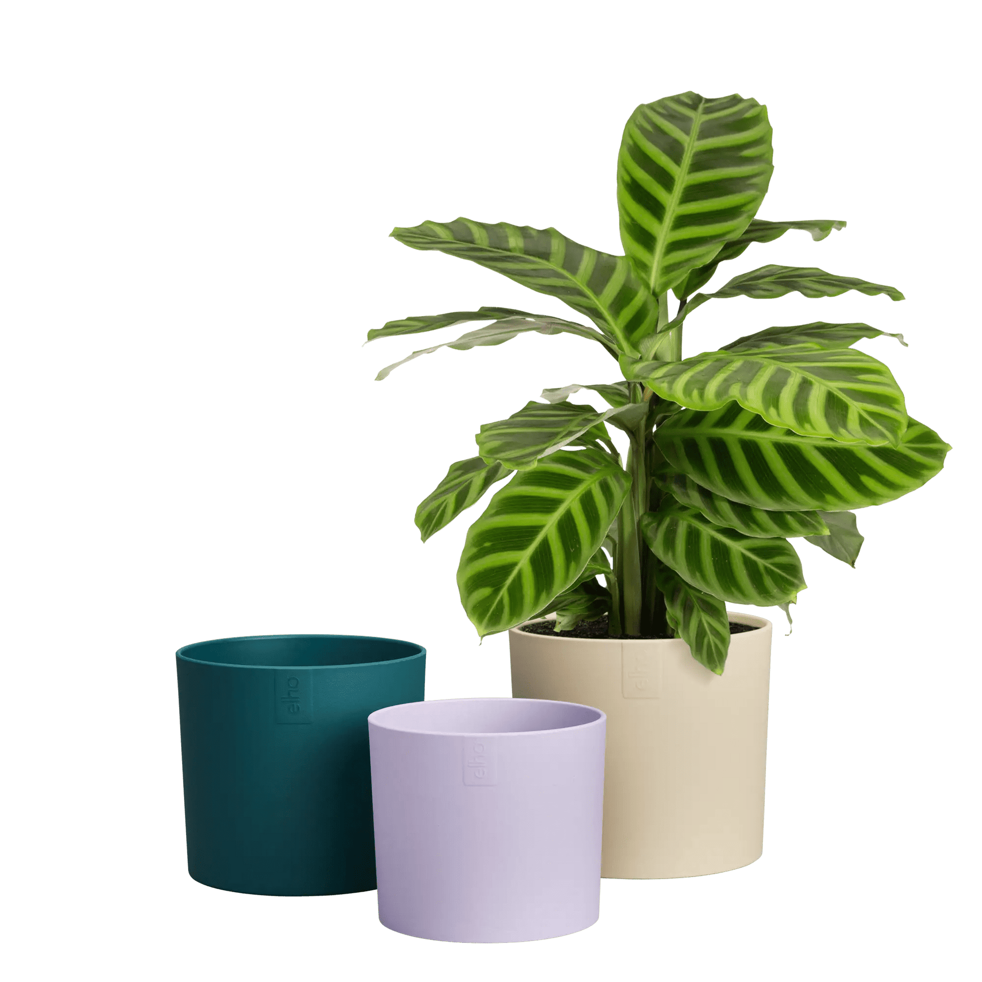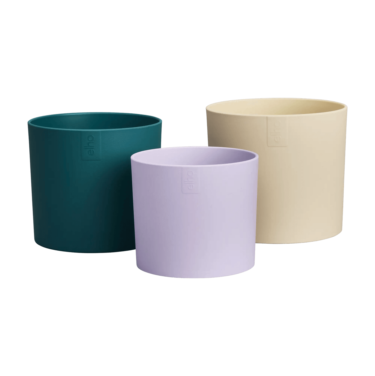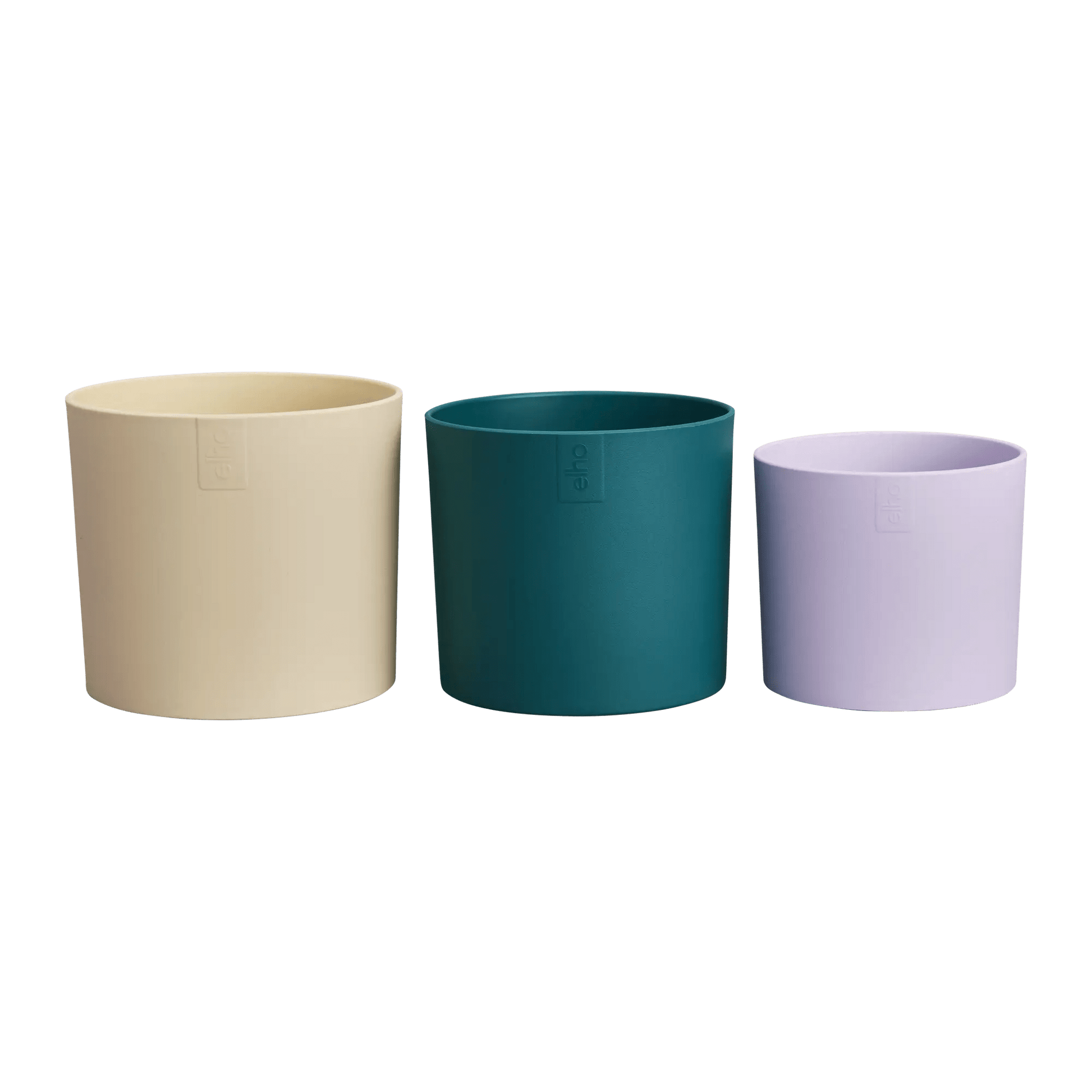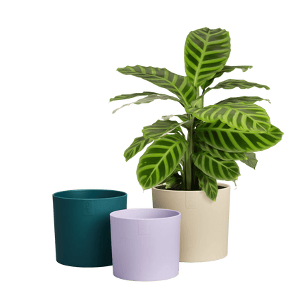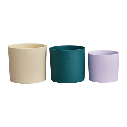 Set of three recycled plastic plant pots in a sand, light violet and a deep teal colour.