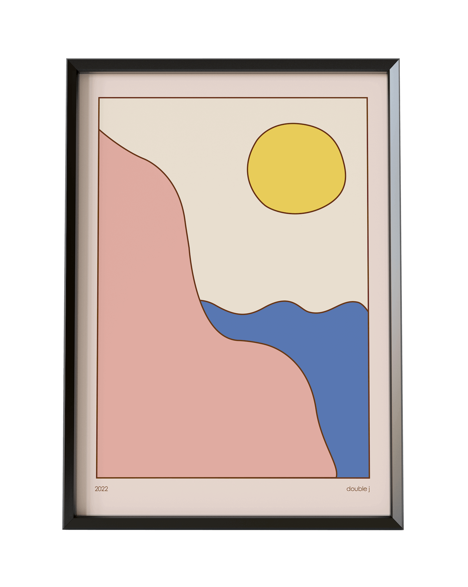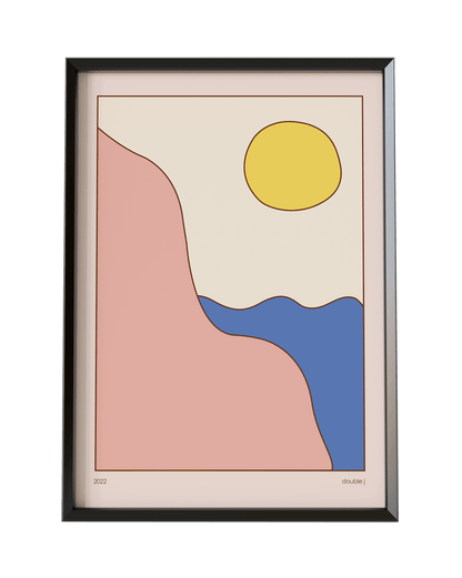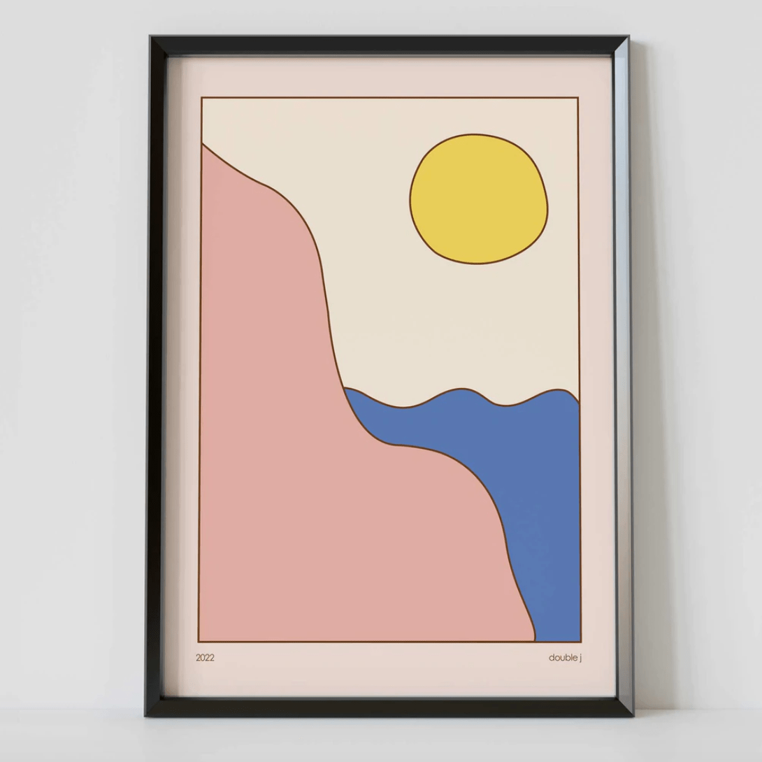 Seaside day is a minimalist design featuring a stylised landscape in relaxing pastel colours.