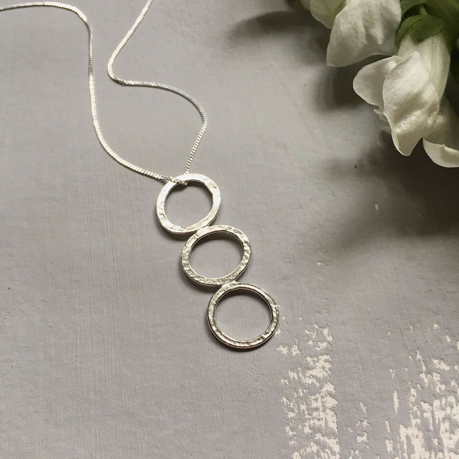 This beautiful sterling silver necklace features three pebble shaped rings in a row. Reminiscent of cairns balanced on hill tops and river boulders, this pendant would be a perfect gift for rambling adventurers and lovers of the outdoors.