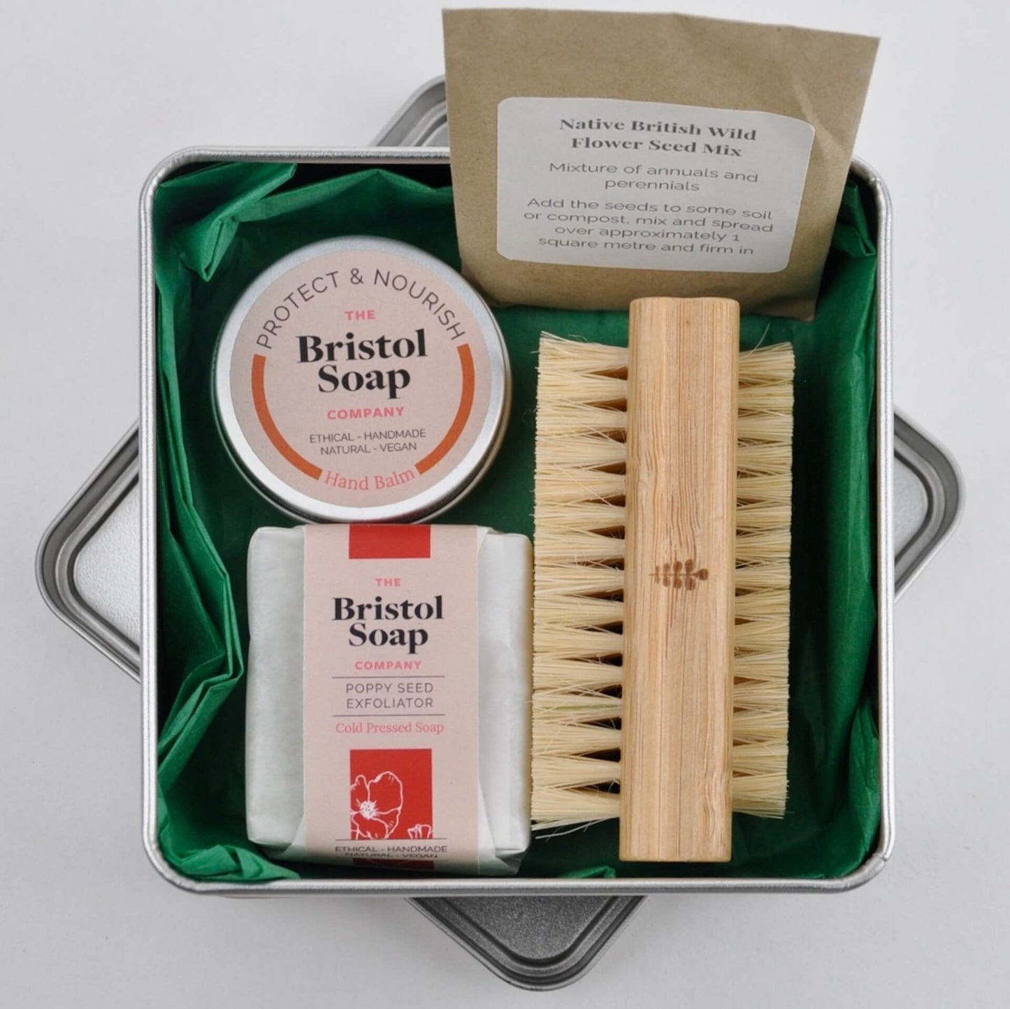 A wonderful gift set from The Bristol Soap Company to suit amateurs and professionals alike. This Gardeners Gift Set comes with a wide & fine bamboo fingernail scrubber, cold pressed Poppy Seed Exfoliator soap, Protect and Nourish Hand Balm and a packet of native British wild flower seeds.