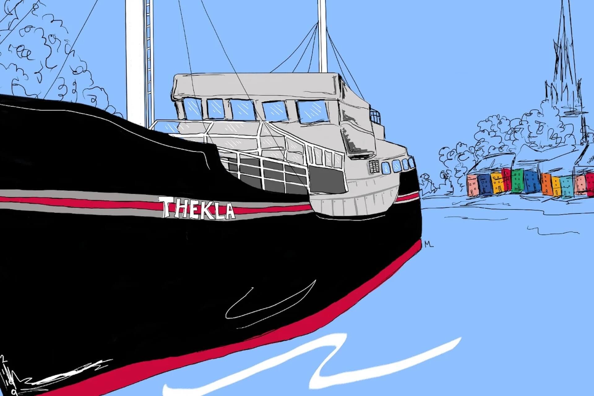 A bold and vibrant print of Thekla, Bristol’s iconic cargo ship turned music venue, recreated in Meg’s distinctive illustrative style.