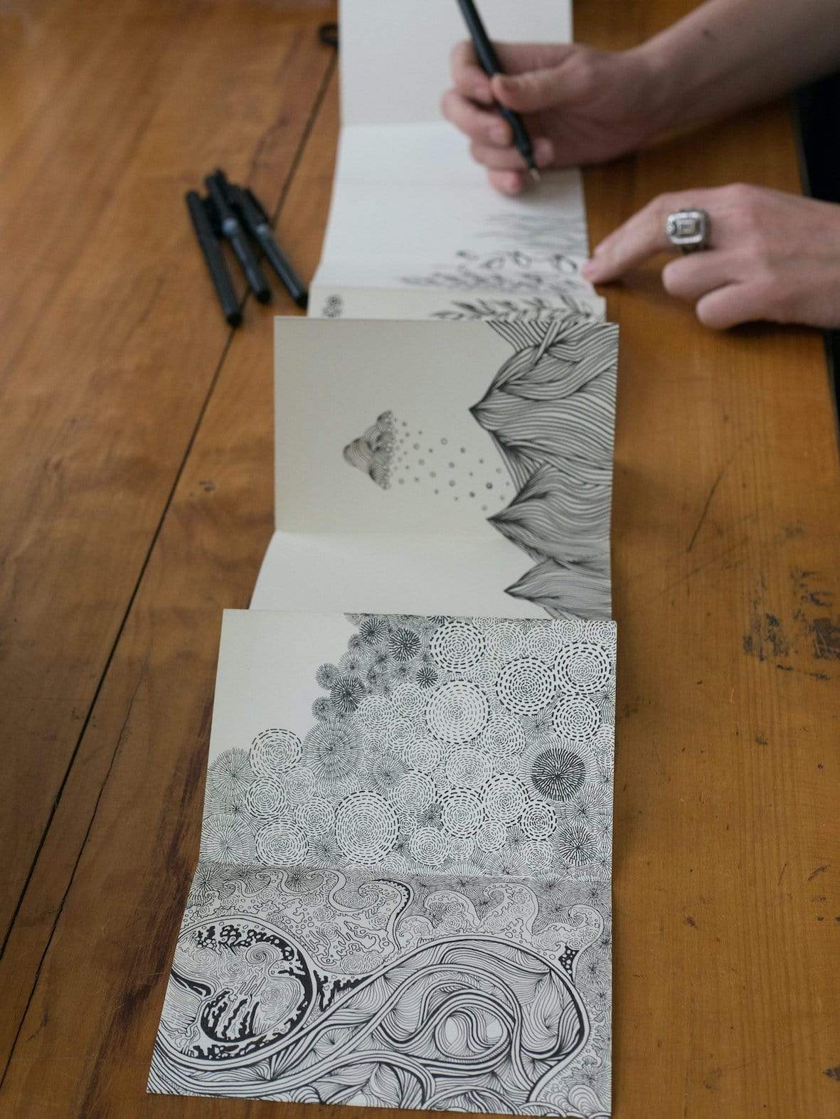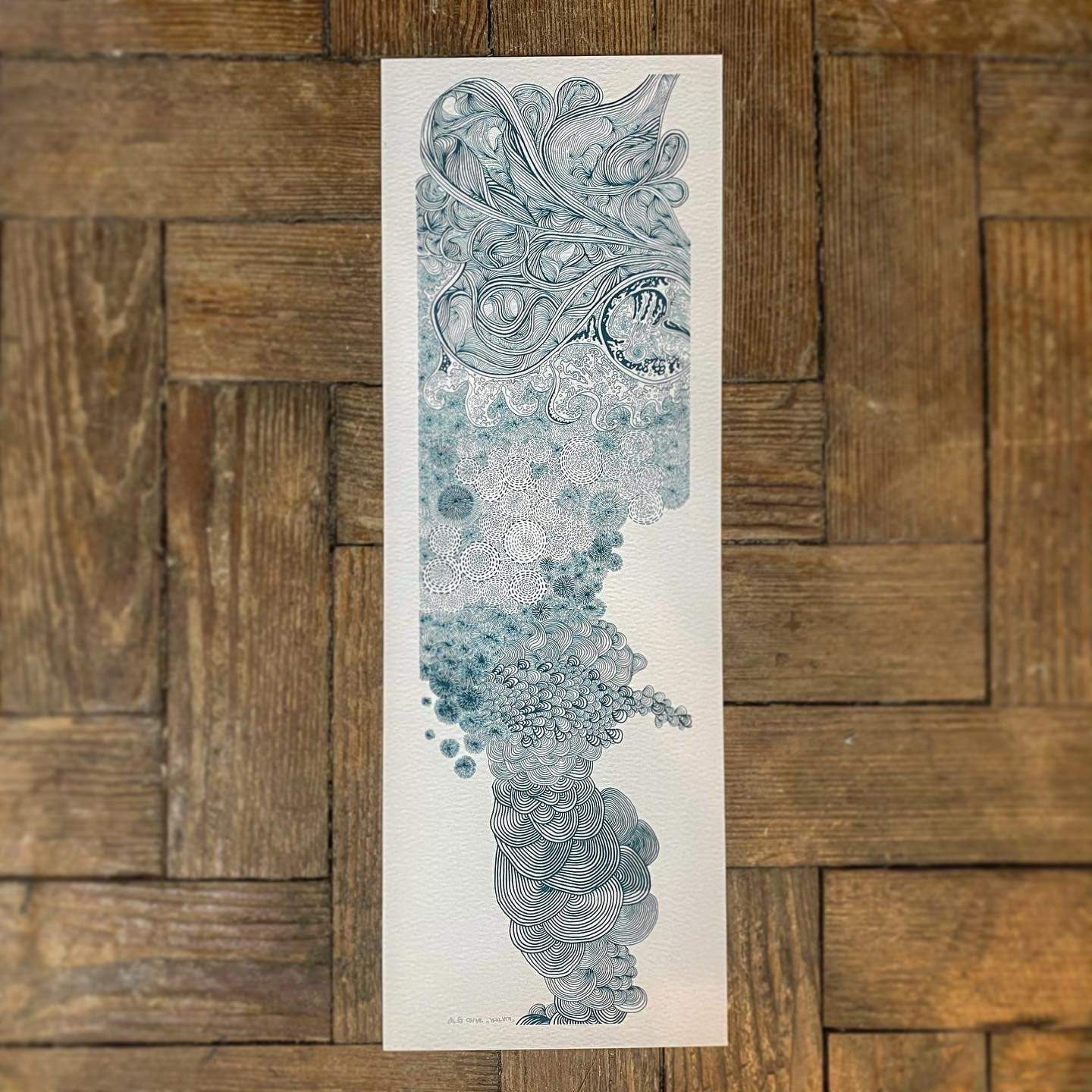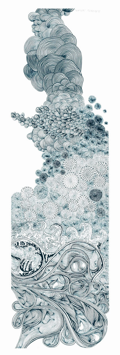 This is a print of an original drawing from a folding book that is a continuous project that Emma has spent a number of years working on. It is part of a series called "The Elements". This particular piece of art is titled "Water"