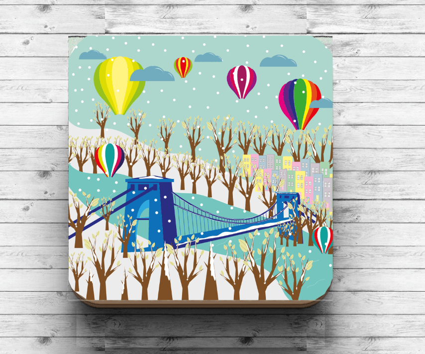 Digitally printed wooden coaster of a wintery and snowy landscape of Bristol and its iconic Suspension Bridge and hot air balloons.